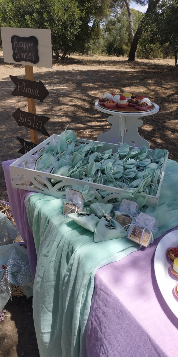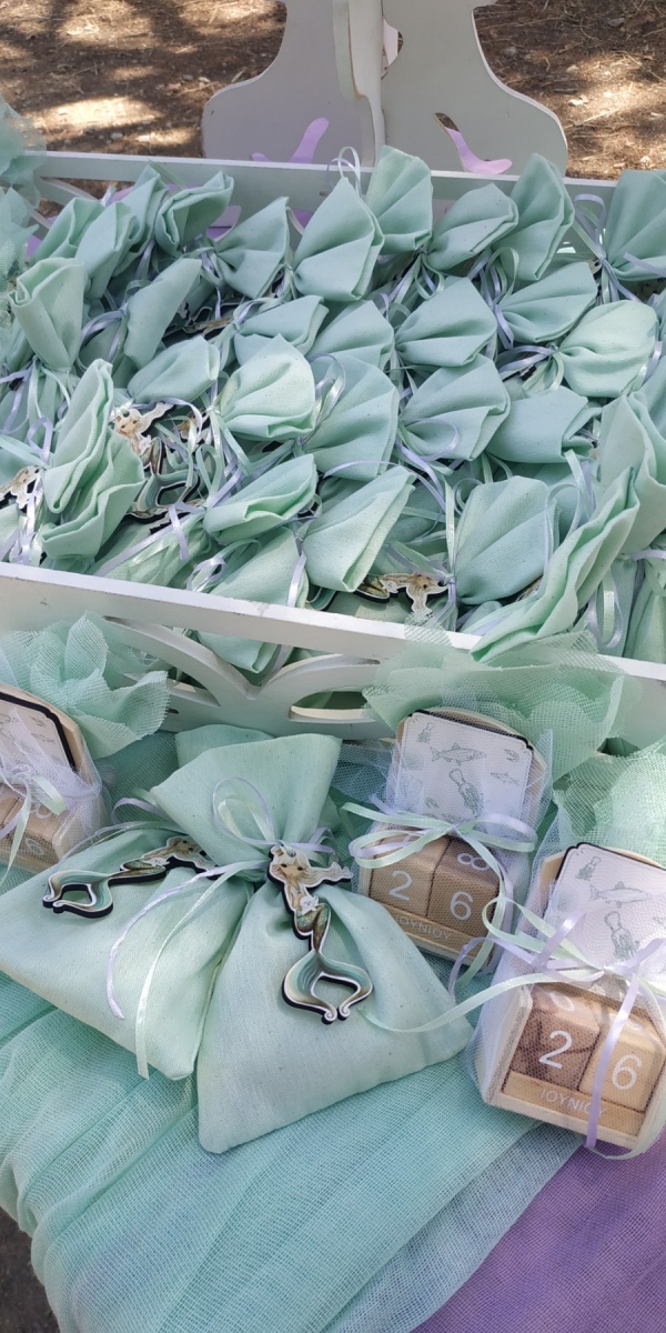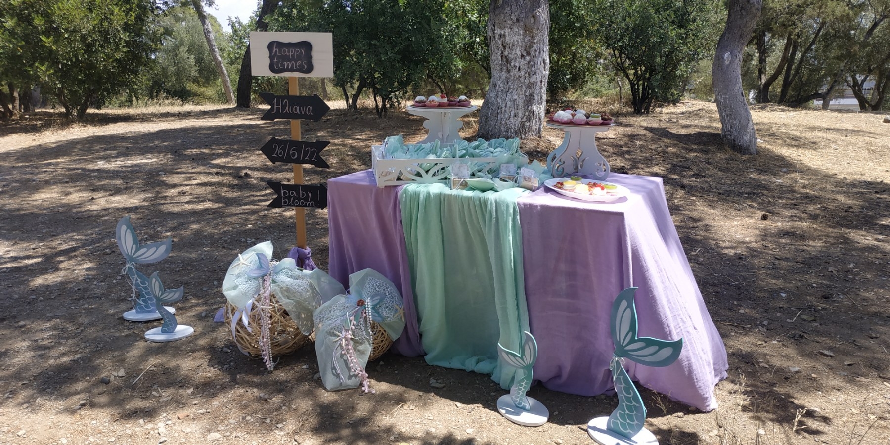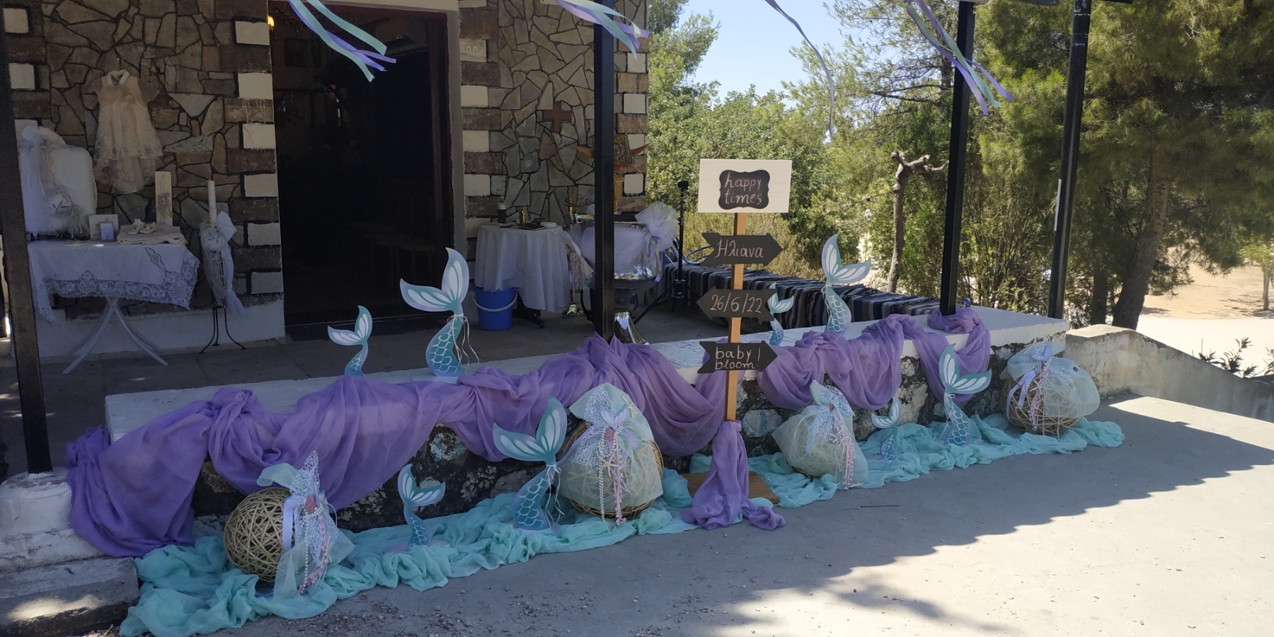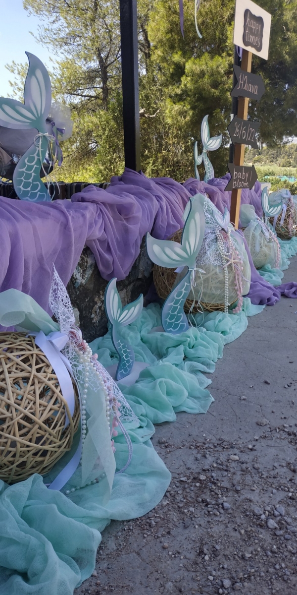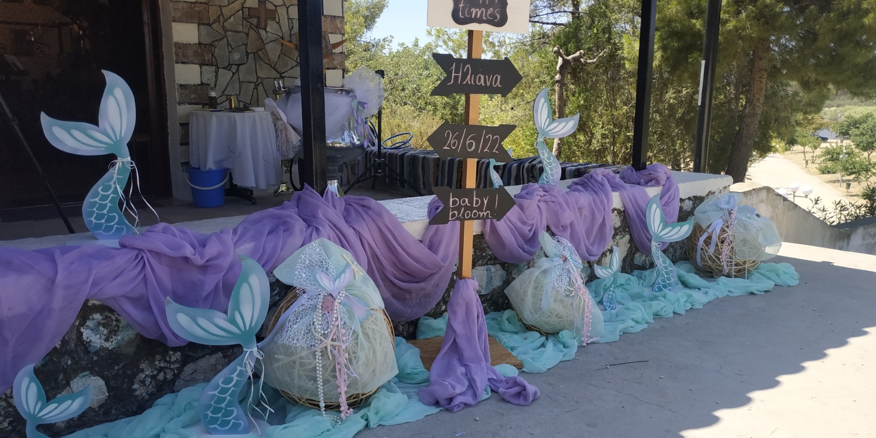Η διακόσμηση της βάπτισης με θέμα την γοργόνα βασίστηκε σε μια παλέτα του λιλά και του τυρκουάζ, δημιουργώντας ένα παραμυθένιο σκηνικό με θέμα τη γοργόνα. Η χρήση χρωματιστών υφασμάτων και η προσοχή στις λεπτομέρειες των στοιχείων του βυθού, συνέθεσαν ένα κομψό και αρμονικό αποτέλεσμα που εναρμονίστηκε πλήρως με τον εξωτερικό χώρο.