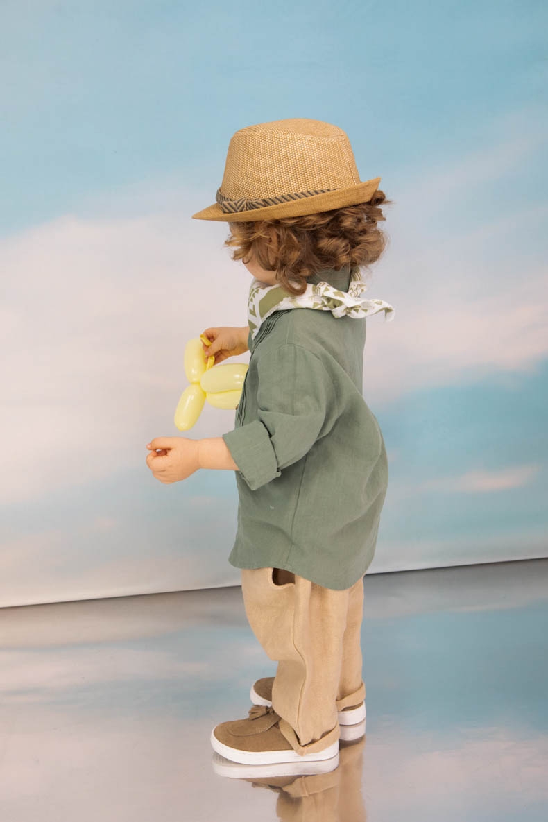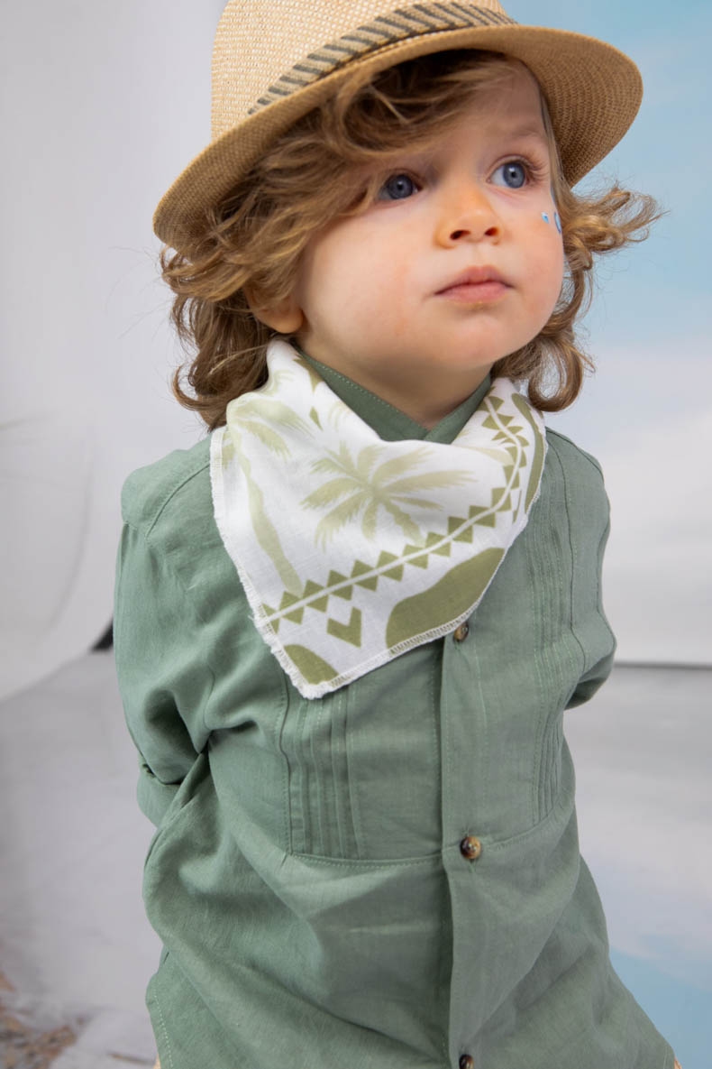 Ο Aggelos είναι ένα σετ βάπτισης σε πολύ ιδιαίτερο χρώμα. Πουκάμισο μάο μέντα με νερβίρ σε λινό 100%. Παντελόνι σε χρώμα μελί σε ύφασμα ψαροκόκκαλο. Φουλάρι με printed σχέδιο με ελέφαντες και φοίνικες. Ζώνη από σκοινί. Καπέλο δίχρωμο μελί με τρέσσα.