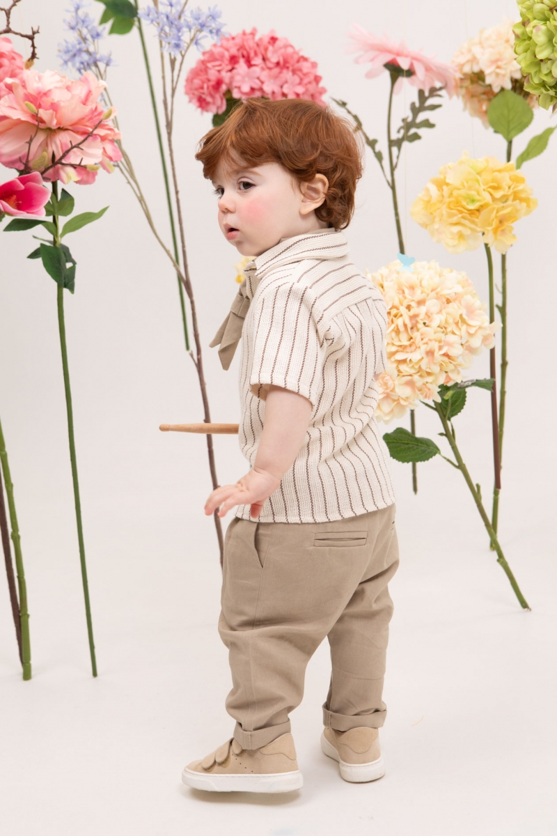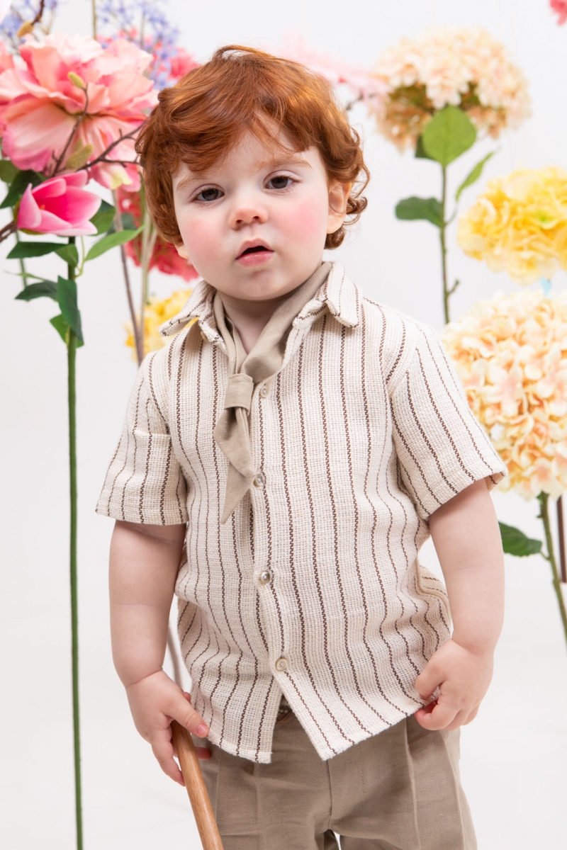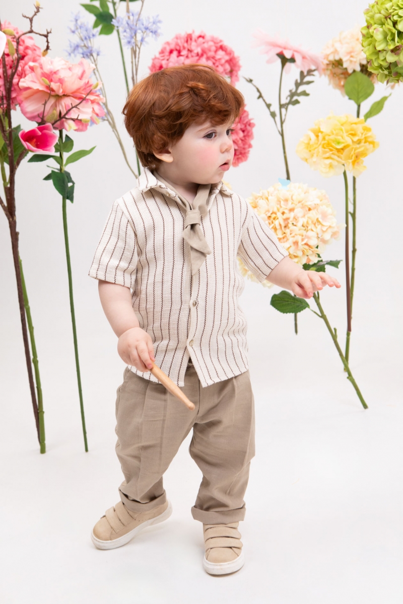Ο Alfonso είναι η απόλυτη επιλογή βάπτισης για το καλοκαίρι του 2026! Αποτελείται από καφέ παντελόνι εξαιρετικής ποιότητας και πλεκτό ριγέ εκρού-καφέ πουκάμισο για ξεχωριστές παρουσίες. Αξεσουάρ είναι η τρέσα για ζώνη , το λευκό καπέλο και το καφέ φουλάρι του.