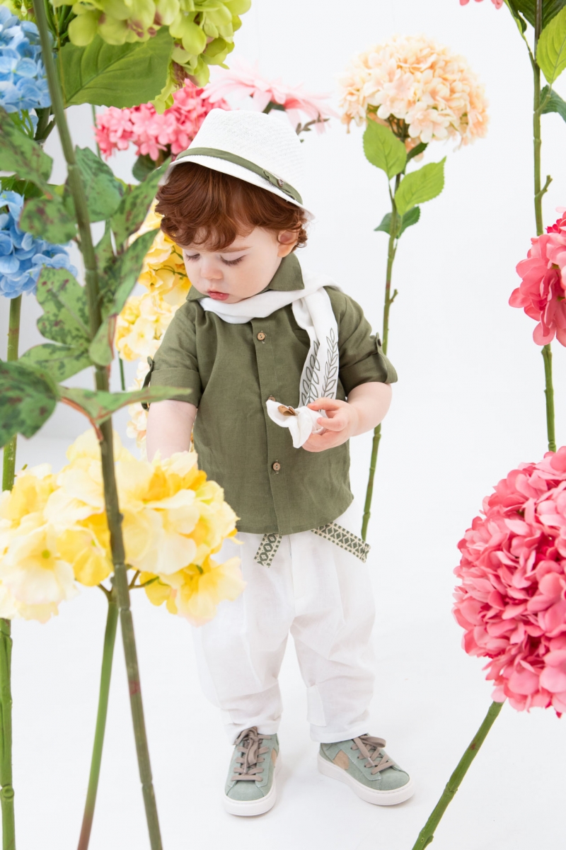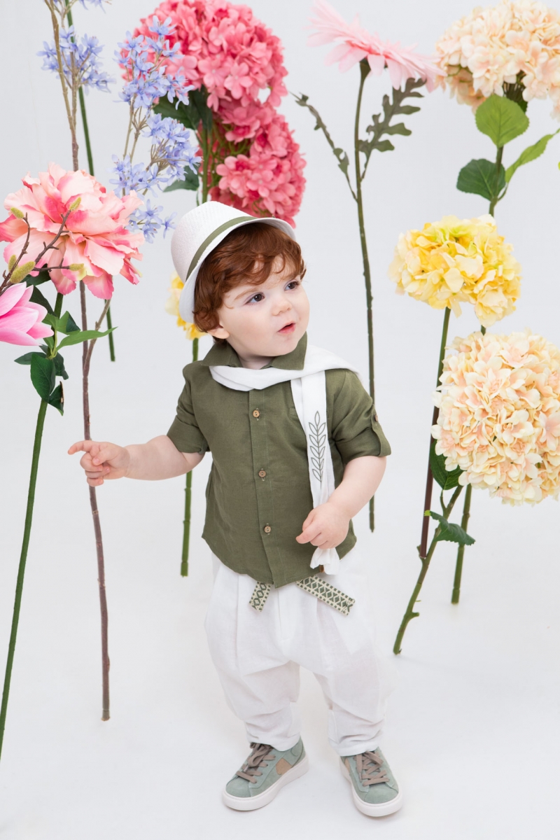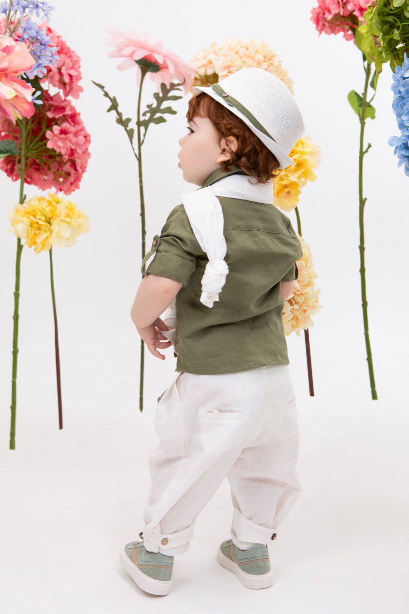 Ο Apollonas είναι chic, modern με πολύ αέρα. Αποτελείται από λαδί πουκαμίσα εξαιρετικής ποιότητας και μοναδικό λευκό λινό παντελόνι με πιέτες και δέσιμο στο κάτω μέρος. Αξεσουάρ είναι το classy λευκό φουλάρι με λαδί κεντήμα, η ζώνη και το λευκό καβούρι του.