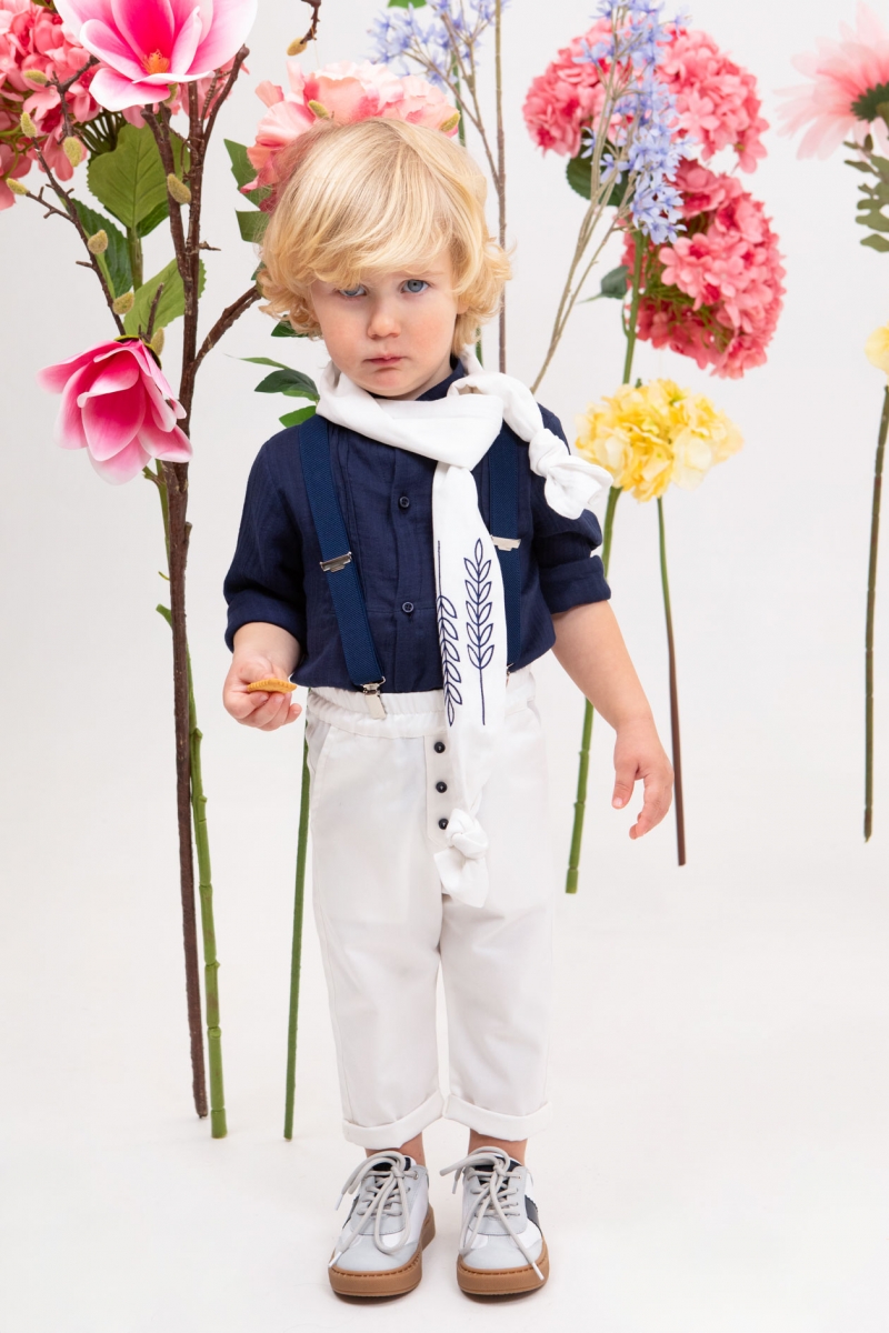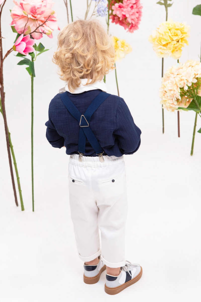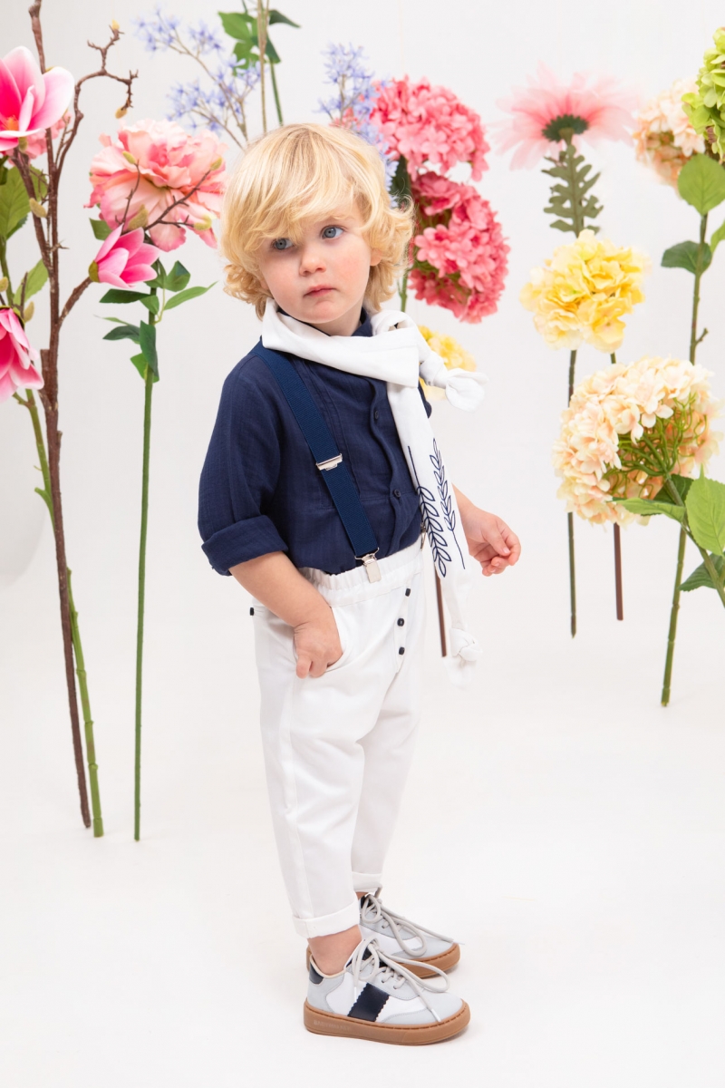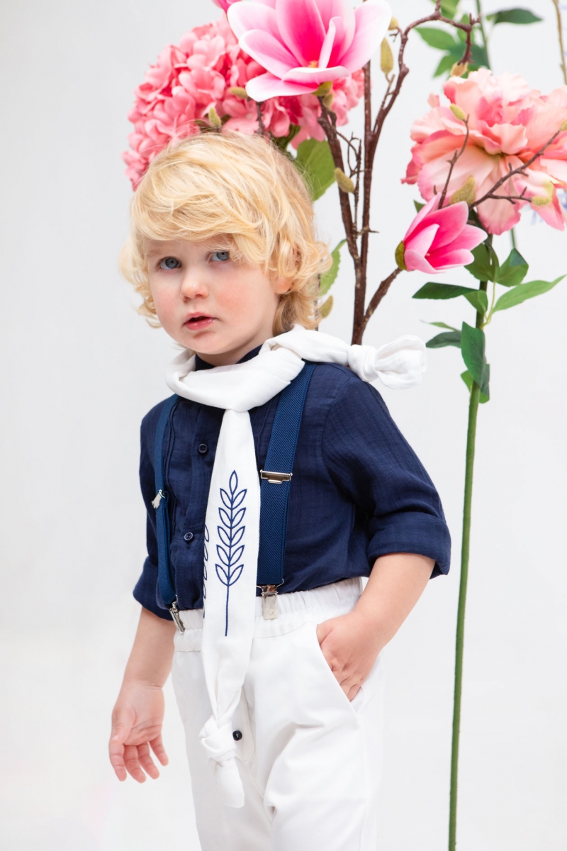 Ο Evan είναι ένας συνδυασμός βάπτισης που έχετε αγαπήσει πολύ. Αποτελείται από λευκή καπαρντίνα παντελόνι με μπλε κουμπιά και μπλε μάο πουκαμίσα με νερβίρ. Αξεσουάρ είναι οι μπλε τιράντες , το λευκό φουλάρι με μπλε κέντημα και το λευκό καπέλο του.