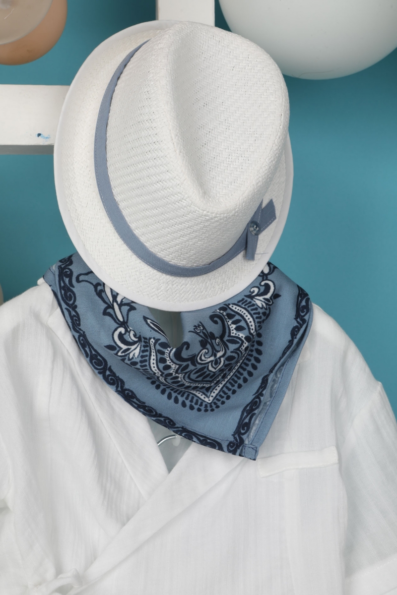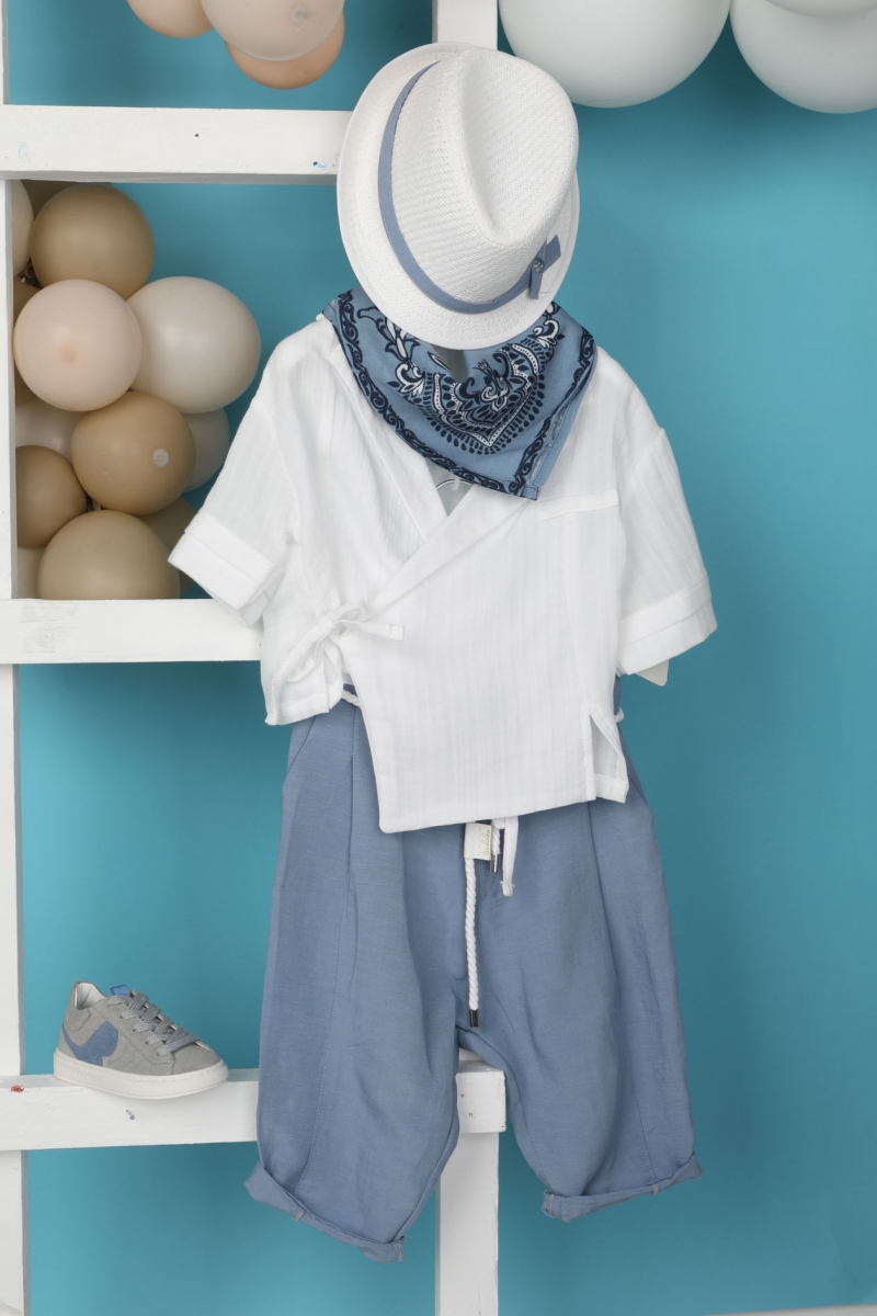 Ο Fernando είναι ένα πολύ stylish βαπτιστικό σετ. Αποτελείται από σιέλ ραφ παντελόνι εξαιρετικής ποιότητας και λευκή σταυρωτή πουκαμίσα. Αξεσουάρ είναι το μπλε printed φουλάρι, το λευκό κορδόνι για ζώνη και το λευκό καπέλο του.