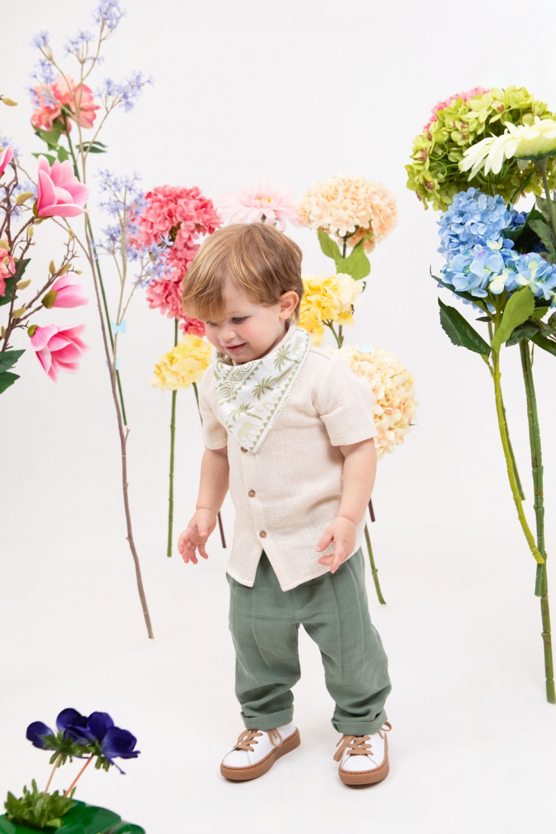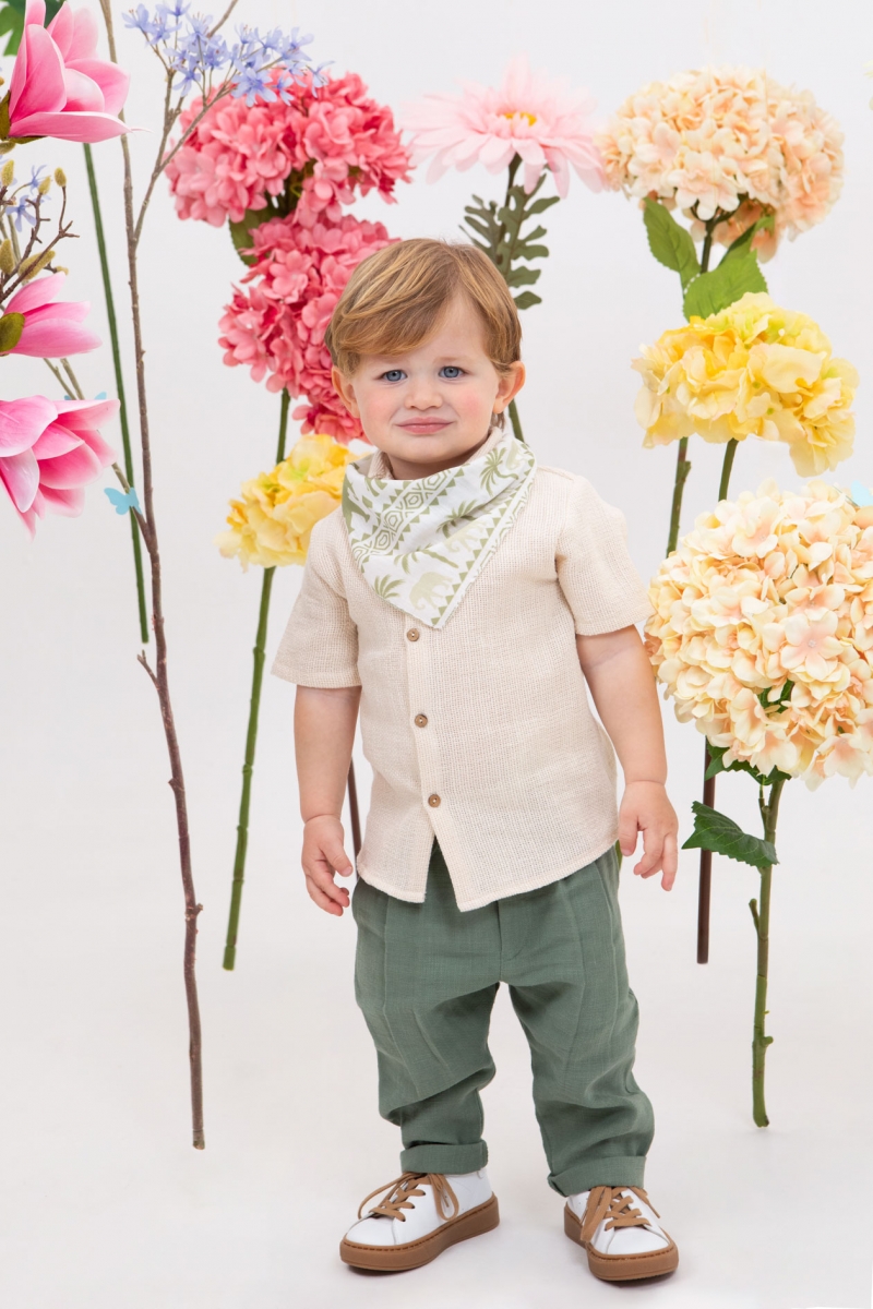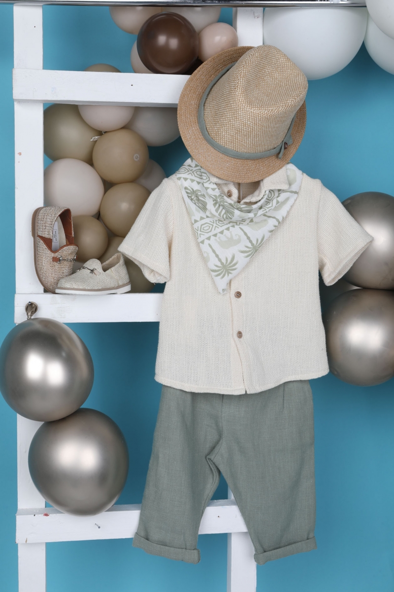 Ο Foivos είναι η τελευταία τάση της μόδας. Συνδυάζει την φανταστική πουκαμίσα σε βανίλια απόχρωση με το μέντα παντελόνι με πιέτες. Αξεσουάρ είναι το ιδιαίτερο φουλάρι η μπεζ ζώνη και το μελί καβούρι του. ART: 1903