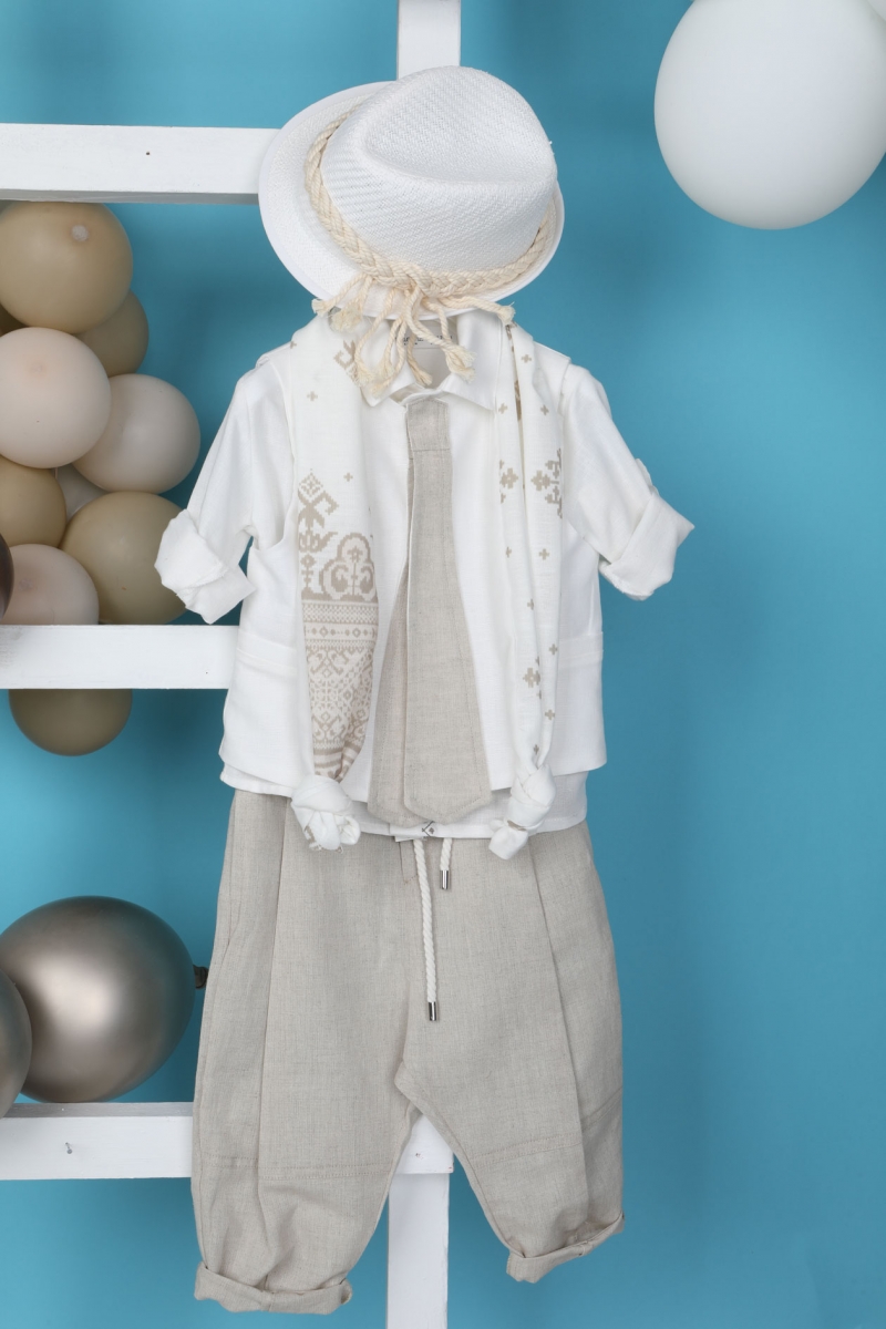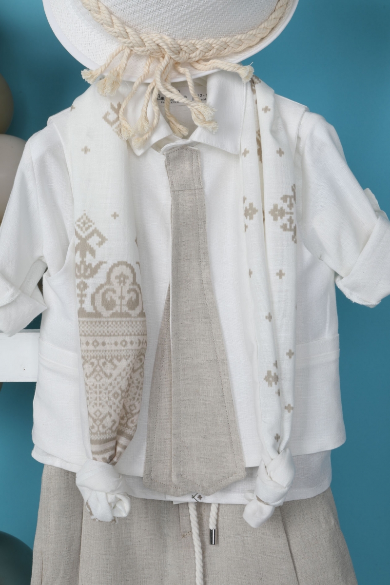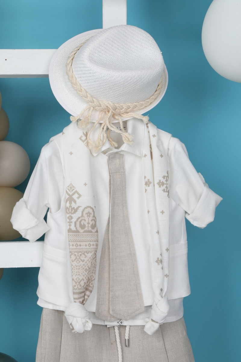 O Gonzalo αποτελείται από σπαγγί λινό παντελόνι, λευκό λινό πουκάμισο με κέντημα και λευκό γιλέκο με σχέδιο γραβάτα. Αξεσουάρ είναι το εκρού κορδόνι για ζώνη, το printed φουλάρι και το λευκό καπέλο του. ART: 1964, BAMBOLINO.