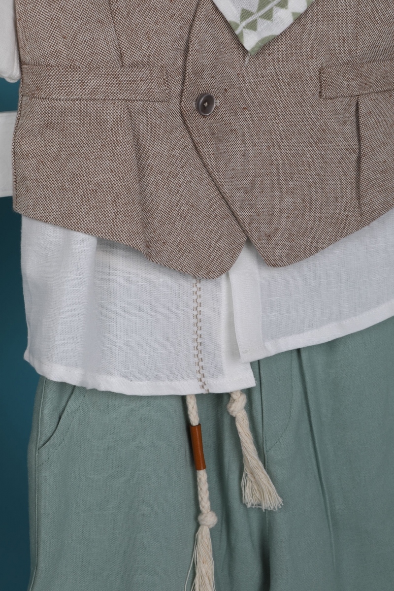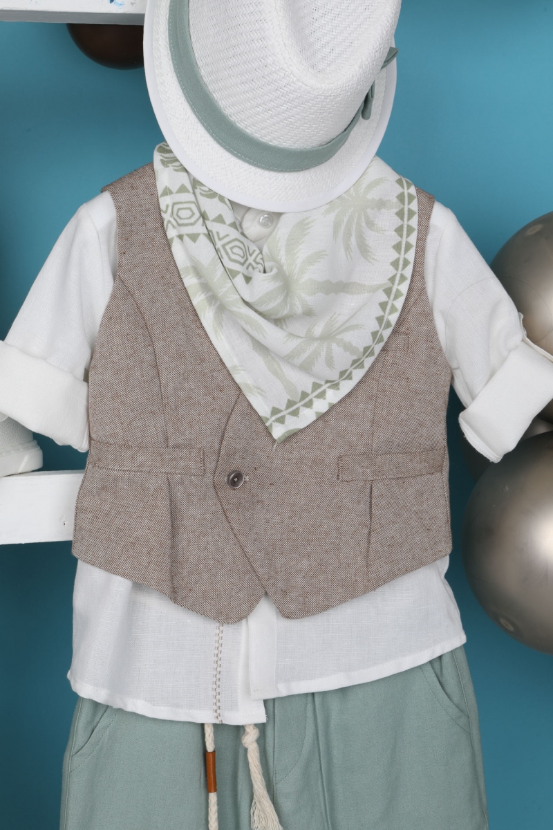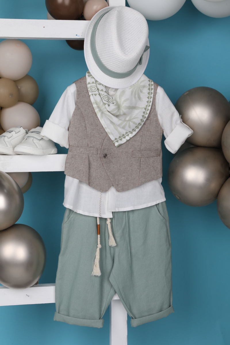 Ο James είναι ένα πολύ ‘’χαρούμενο’’ βαπτιστικό σύνολο με καλοκαιρινή διάθεση. Αποτελείται από μέντα παντελόνι, λευκό λινό πουκάμισο με μάο γιακά και κέντημα εξαιρετικής ποιότητας και στραβό μπεζ γιλέκο με μοντέρνο κόψιμο. Αξεσουάρ είναι το εκρού-ταμπά κορδόνι για ζώνη, το λευκό καπέλο και το printed φουλάρι με χαβανέζικη διάθεση.