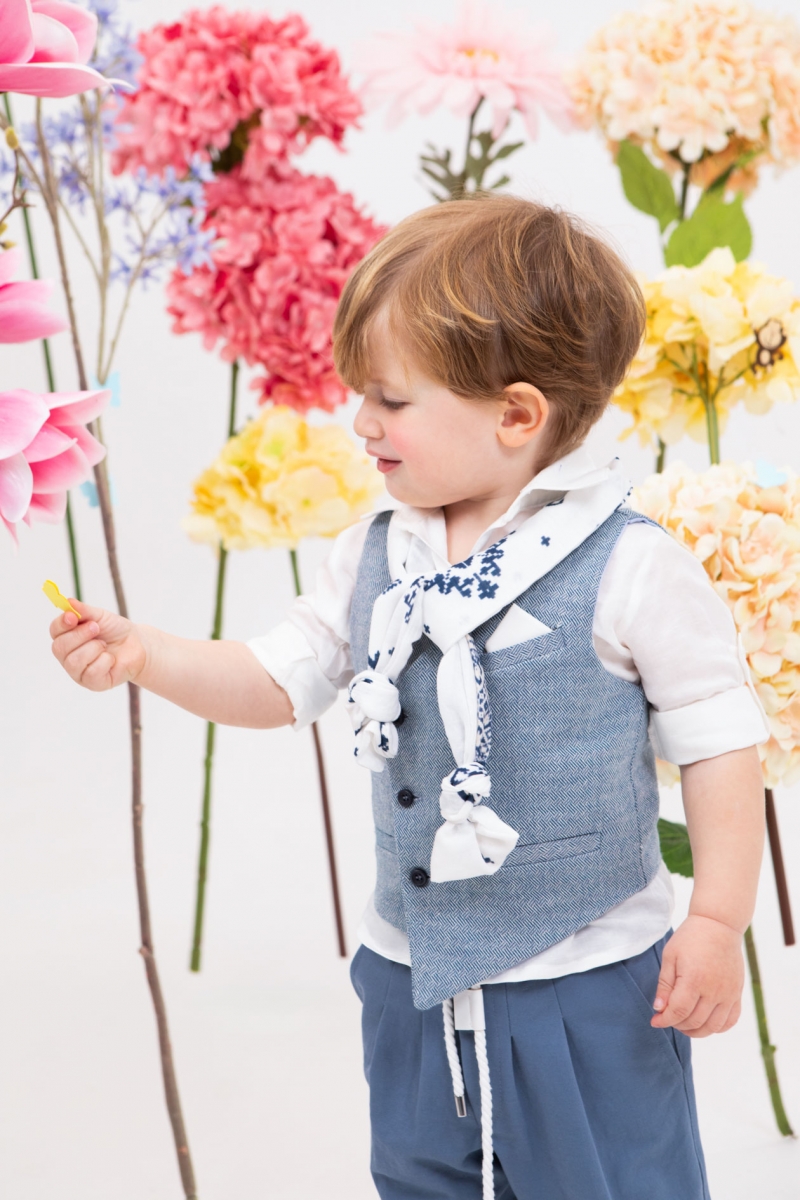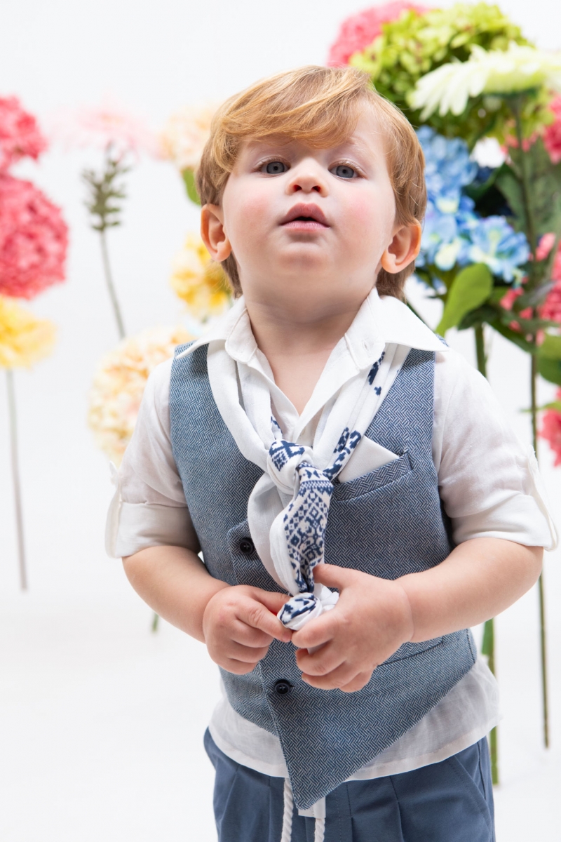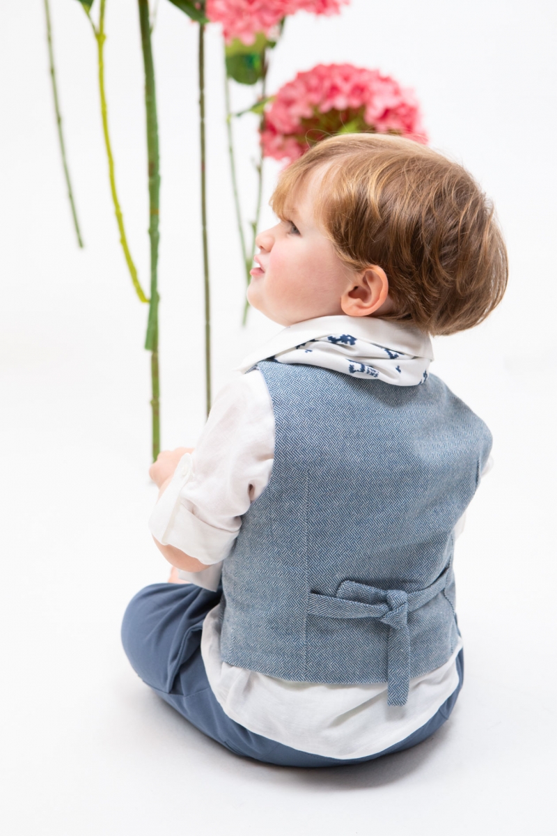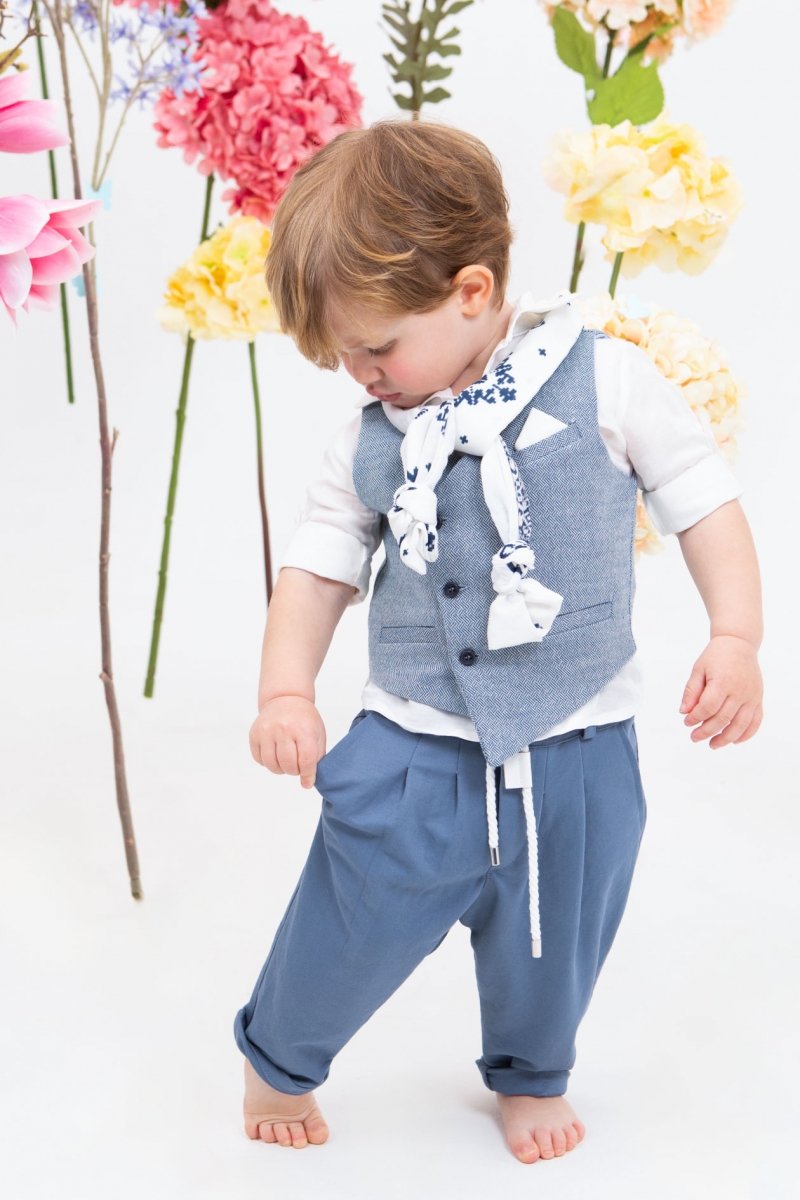 Ο Larry είναι ένα βαπτιστικό σύνολο σε μπλε αποχρώσεις με μοντέρνες πινελιές. Αποτελείται από μπλε παντελόνι , λευκό βαμβακερό πουκάμισο και στραβό μπλε γιλέκο με σχέδιο εξαιρετικής ποιότητας. Αξεσουάρ είναι το κορδόνι για ζώνη, το λευκό καπέλο και το chic μπλε φουλάρι του.