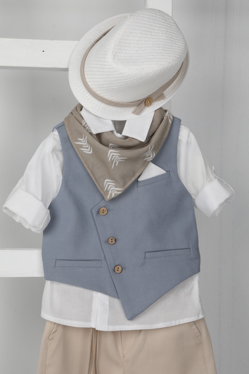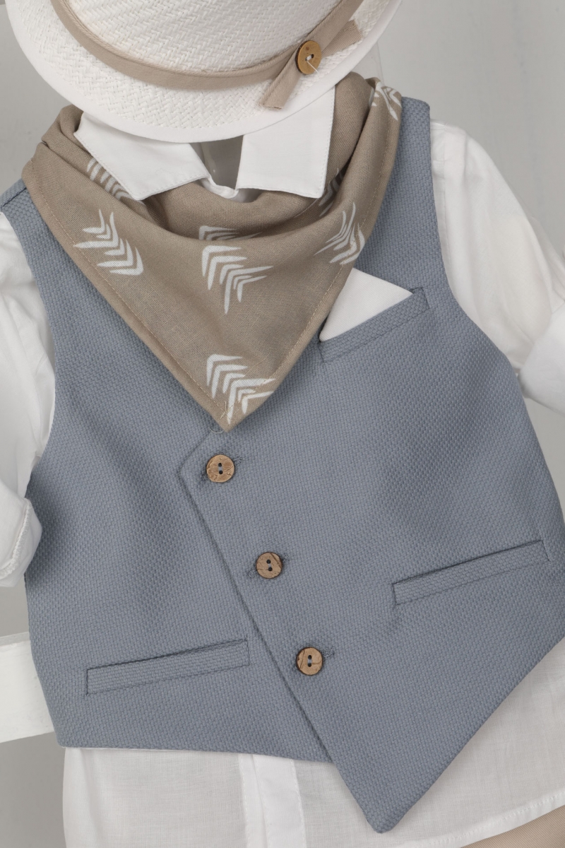 Leandros: Για τους λάτρεις του κλασικού ο Leandros είναι μία εξαιρετική επιλογή. Αποτελείται από κρεμ καπαρντίνα παντελόνι , λευκό βαμβακερό πουκάμισο και στραβό ραφ γιλέκο διακοσμημένο με ξύλινα κουμπιά. Αξεσουάρ είναι το μπεζ κορδόνι για ζώνη, το λευκό καπέλο και το σκούρο μπεζ φουλάρι με σχέδιο.