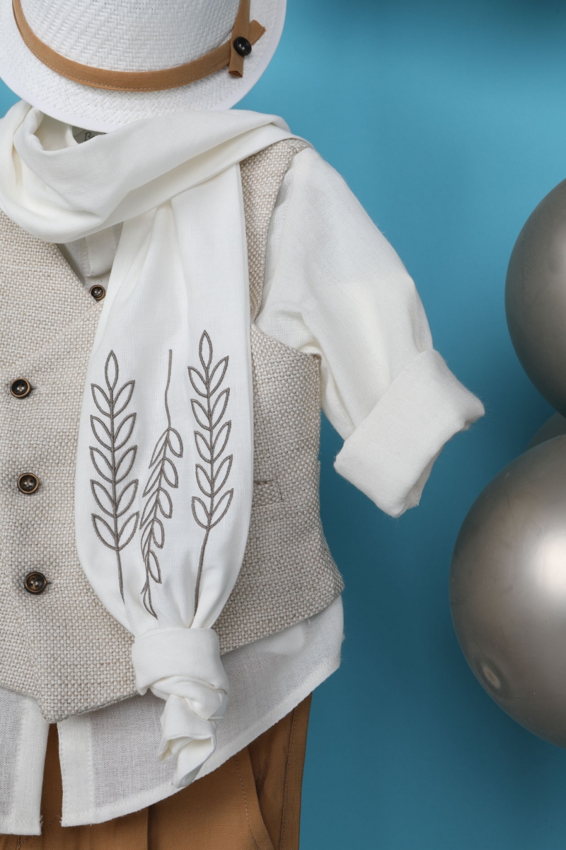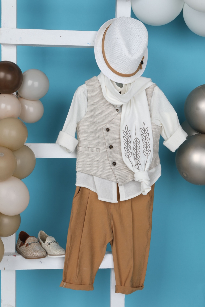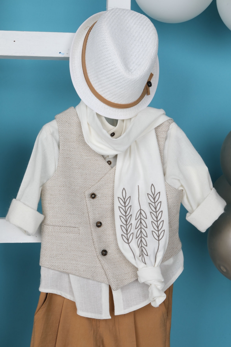 Ο Nikitas αποτελείται από κεραμιδί παντελόνι , πουκαμίσα με νερβίρ γάζα και στραβό πλεκτό μπεζ γιλέκο. Αξεσουάρ είναι το λευκό καπέλο και το κεντημένο φουλάρι εξαιρετικής ποιότητας. ART: 1942, BAMBOLINO.