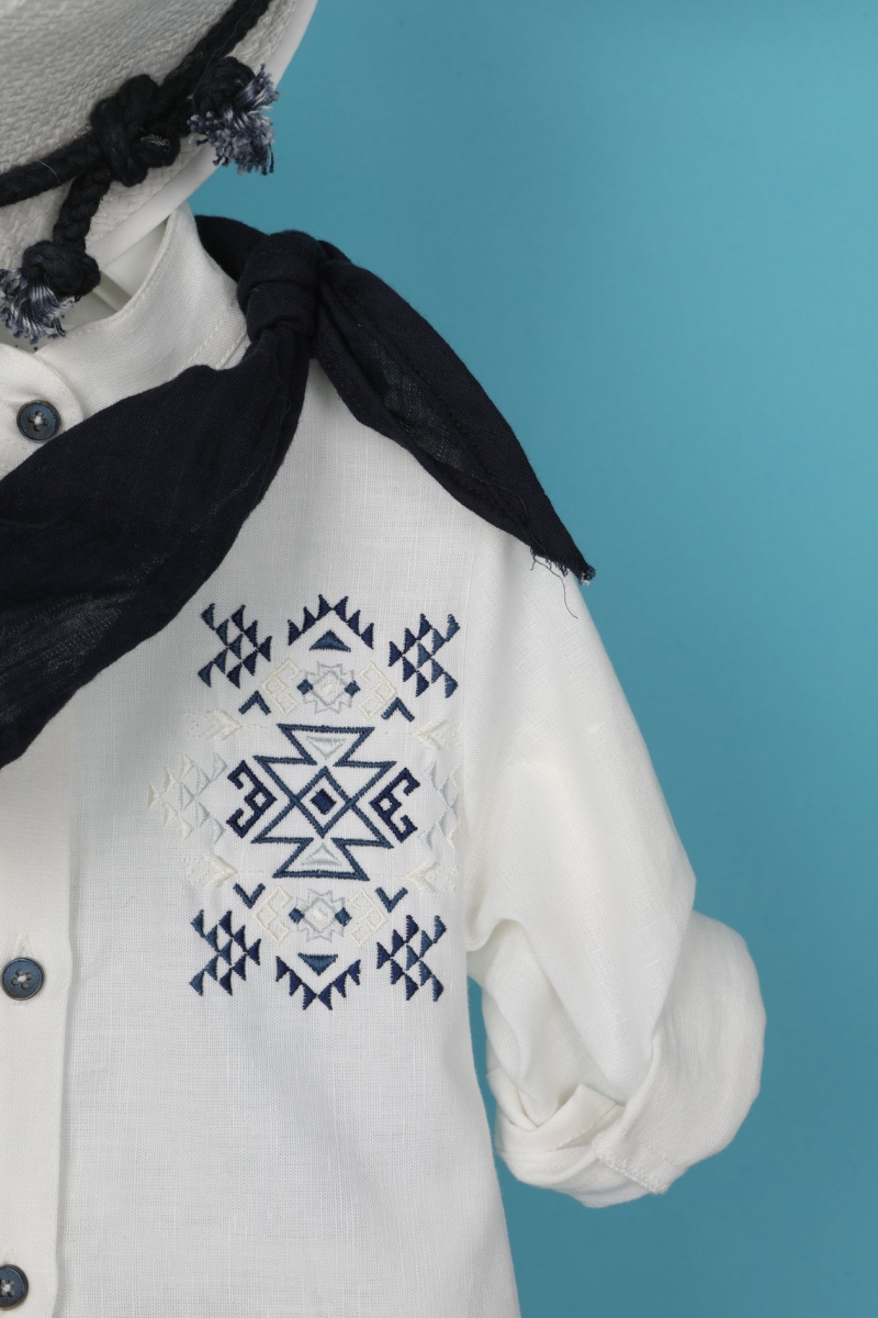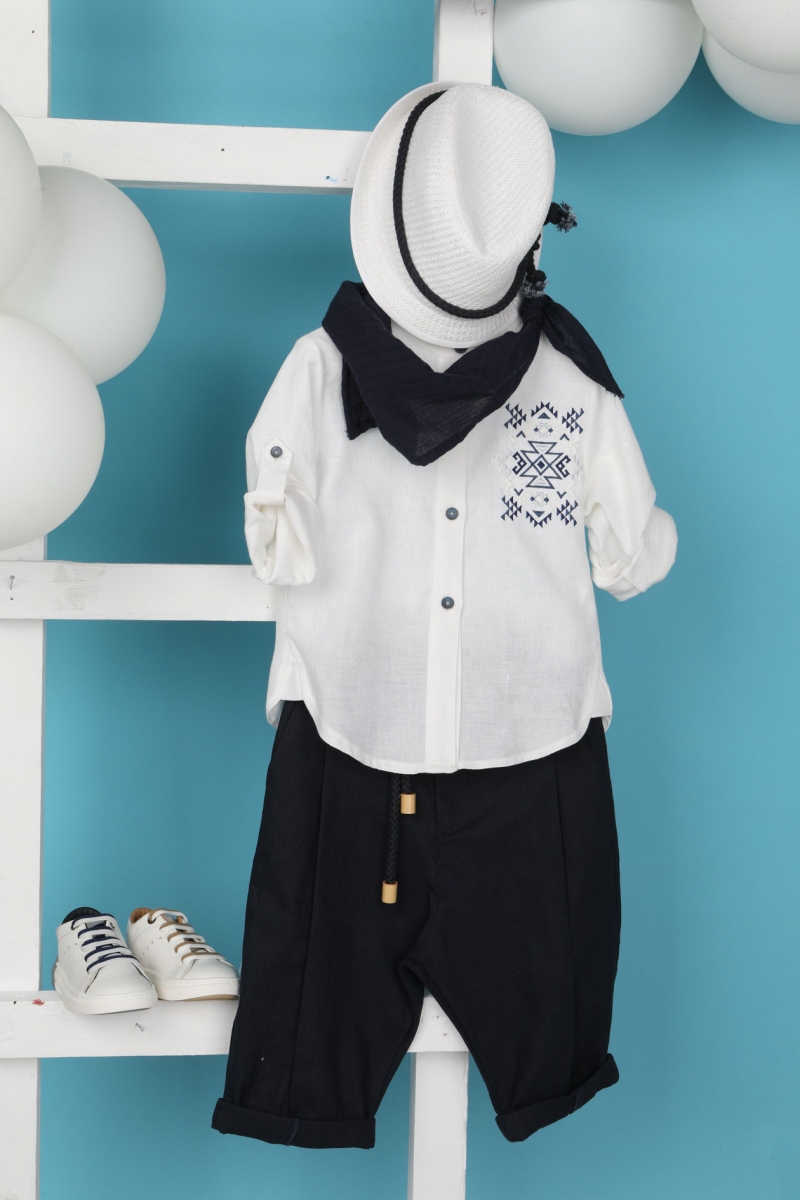 Ο Oliver είναι ένα εξαιρετικής ποιότητας βαπτιστικό σετ σε μπλε –λευκή απόχρωση. Αποτελείται από μπλε λινό παντελόνι και λευκό λινό πουκάμισο με μάο γιακά και μπλε κέντημα που κάνει το σύνολο μοναδικό. Αξεσουάρ είναι το μπλε κορδόνι για ζώνη, το λευκό καπέλο και το μπλε φουλάρι του.