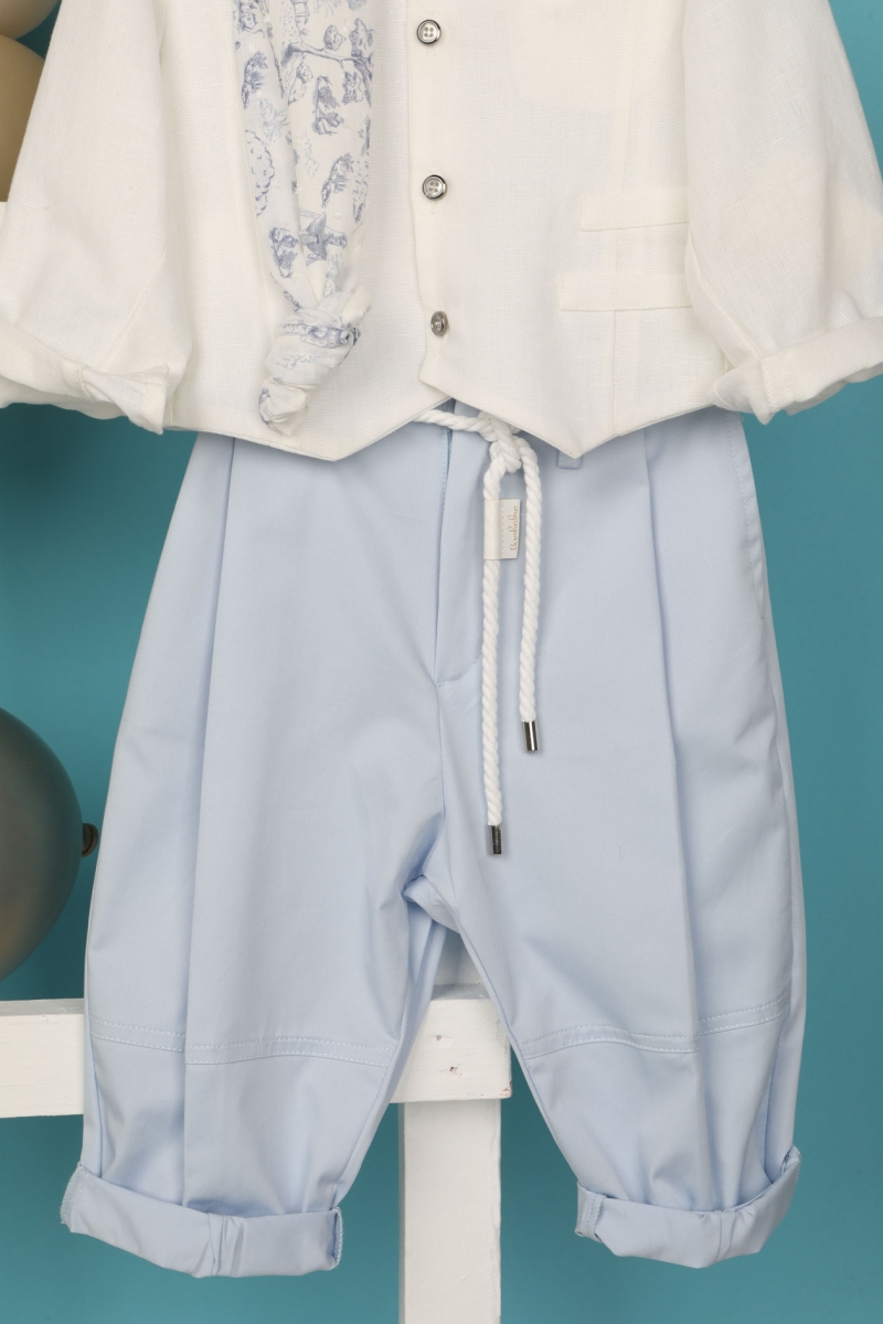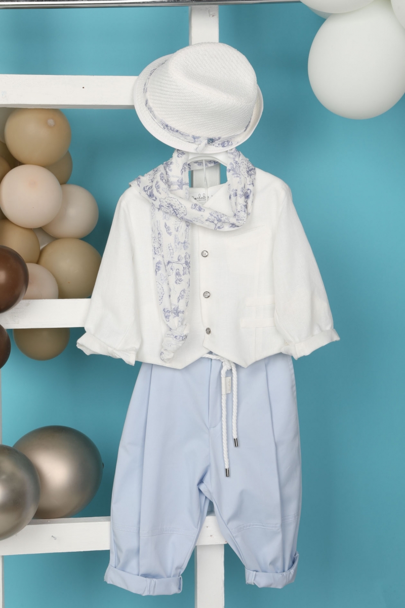 Ο Othonas είναι μία νέα πρόταση για βαπτιστικό σετ με πολύ στυλ και φινέτσα. Αποτελείται από σιέλ καπαρντίνα παντελόνι και λευκό λινό πουκαμισογιλέκο εξαιρετικής ποιότητας. Αξεσουάρ είναι το λευκό κορδόνι για ζώνη , το μωβ φουλάρι με σχέδιο και το λευκό καπέλο του.