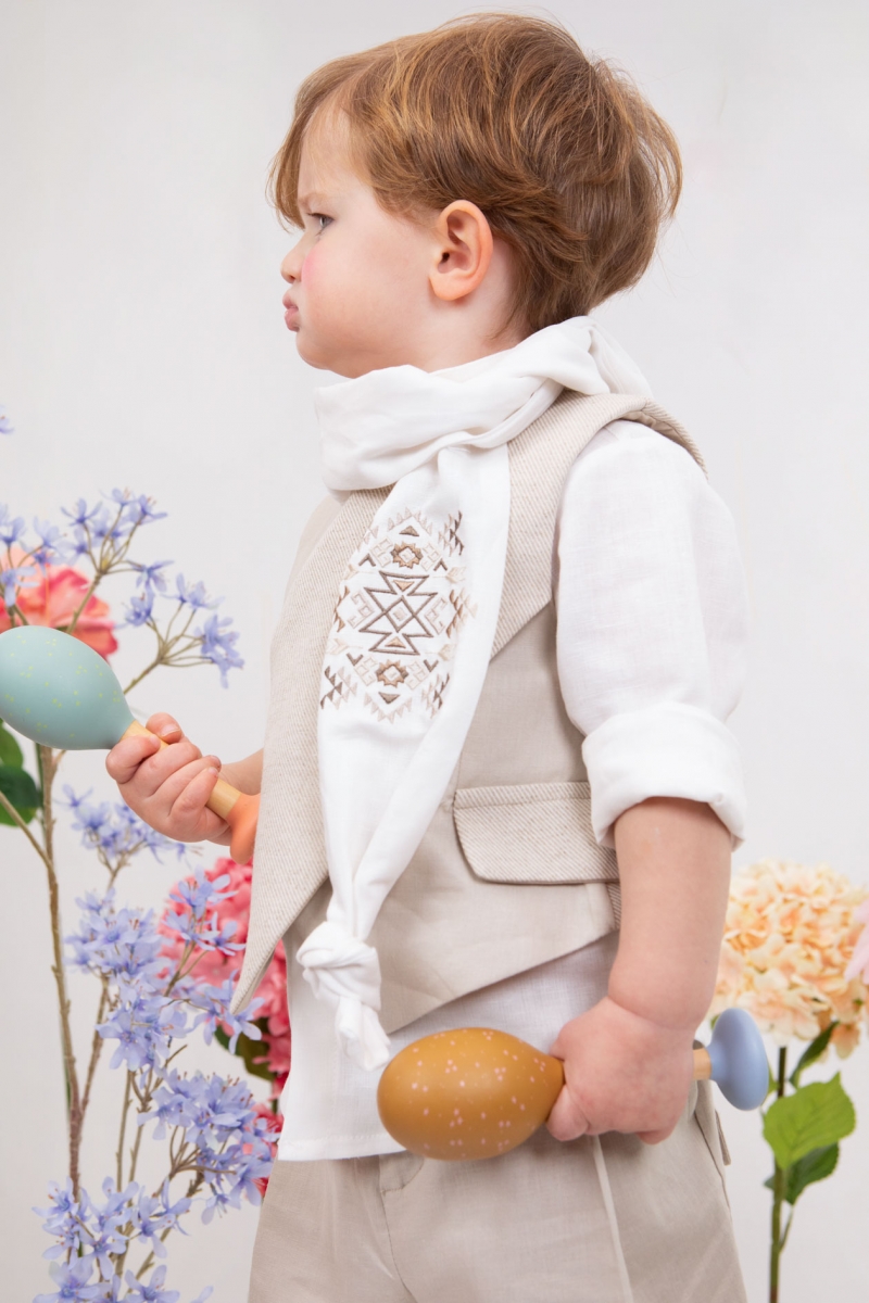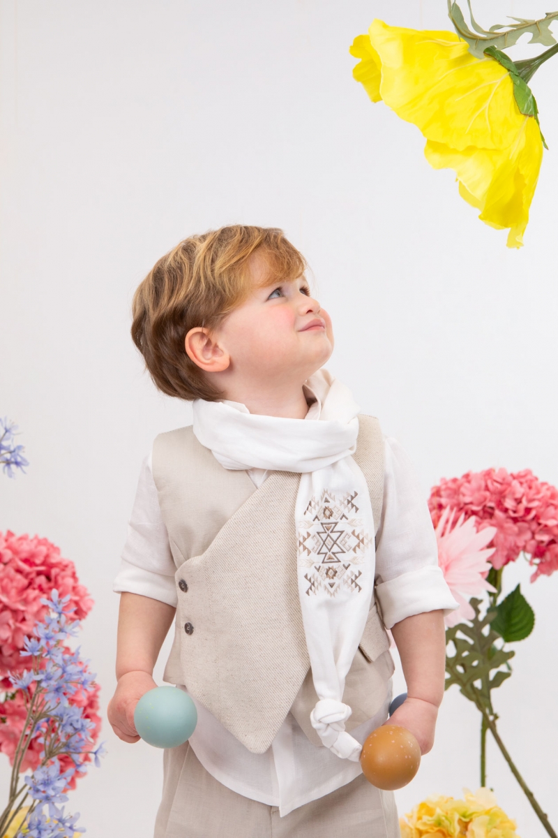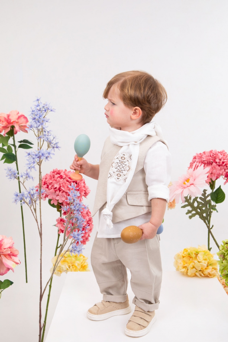 Ο Peter είναι ένας μοντέρνος μπεζ συνδυασμός που θα σας ενθουσιάσει. Αποτελείται από μπεζ λινό παντελόνι εξαιρετικής ποιότητας , λευκό λινό πουκάμισο με μάο γιακά και διπλό μπεζ γιλέκο το οποίο είναι διακοσμημένο με chic κουμπιά. Αξεσουάρ είναι η δερμάτινη μπεζ ζώνη , το λευκό φουλάρι με το κέντημα και το λευκό καπέλο του.