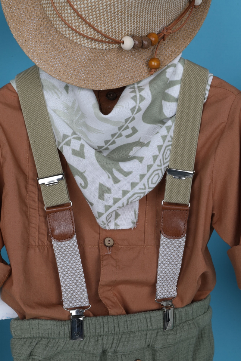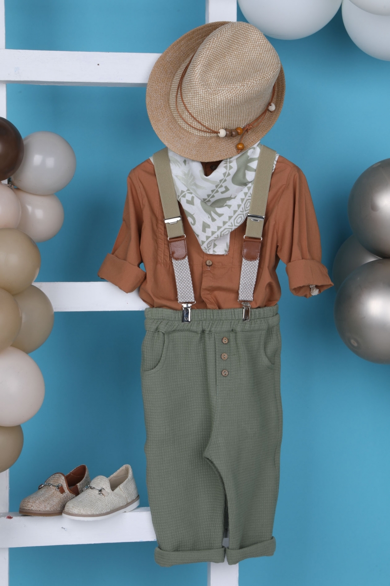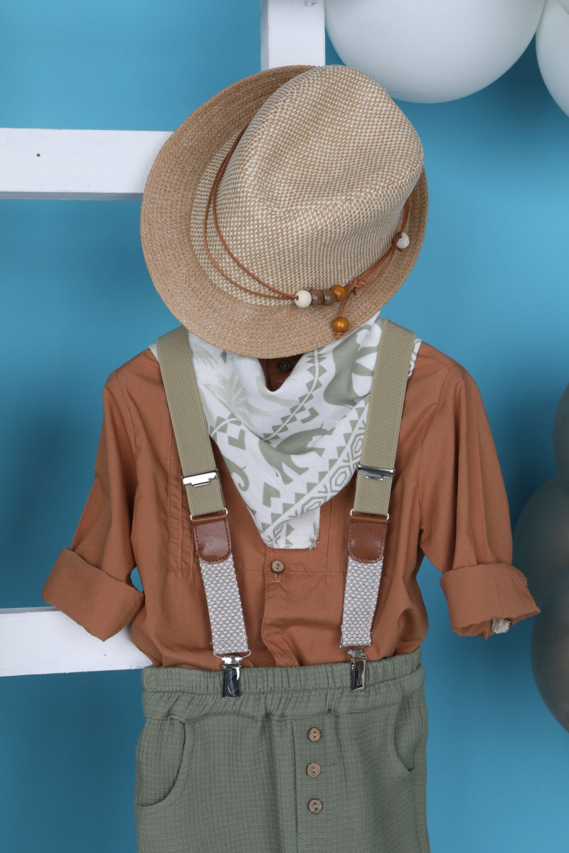 Ο Sokratis είναι ένας νέος συνδυασμός βάπτισης με πολύ καλοκαιρινά στοιχεία. Πιο συγκεκριμένα, αποτελείται από πράσινο μαλακό παντελόνι και κεραμιδί πουκάμισο εξαιρετικής ποιότητας. Αξεσουάρ είναι οι μπεζ τιράντες, το μελί καπέλο και το chic φουλάρι.
