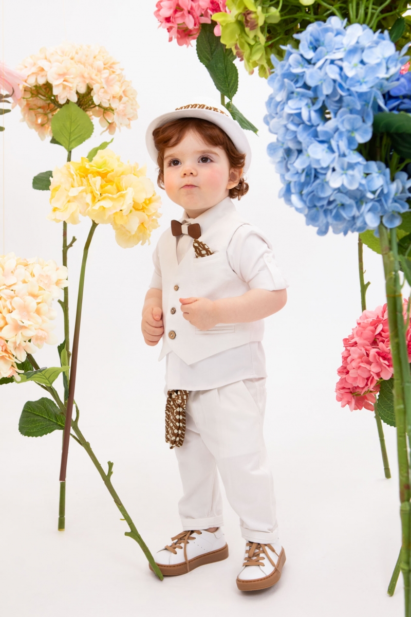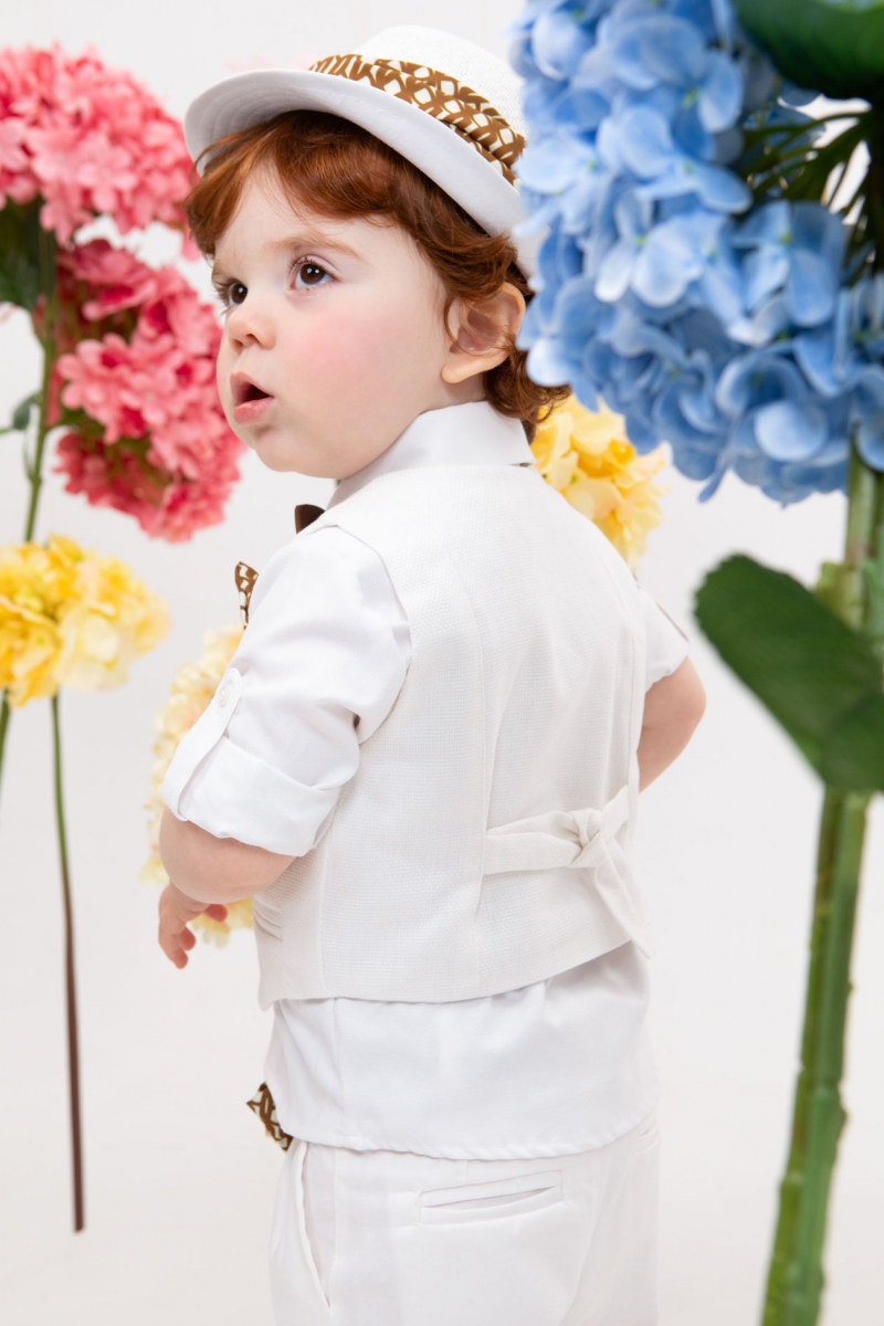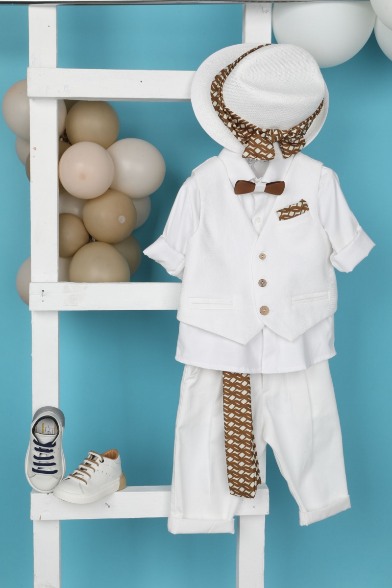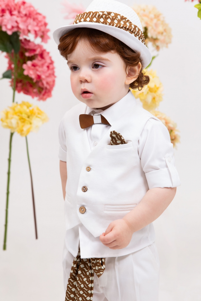 Ο Stefan είναι ένα λευκό κοστούμι με καφέ λεπτομέρειες. Συνδυάζει το λευκό καπαρντίνα παντελόνι με πιέτες , το λευκό πικέ πουκάμισο και το λευκό γιλέκο ψάθα το οποίο είναι διακοσμημένο με ιδιαίτερα κουμπιά. Αξεσουάρ είναι η ζώνη από καφέ φουλάρι , το λευκό καπέλο και το ξύλινο παπιγιόν.