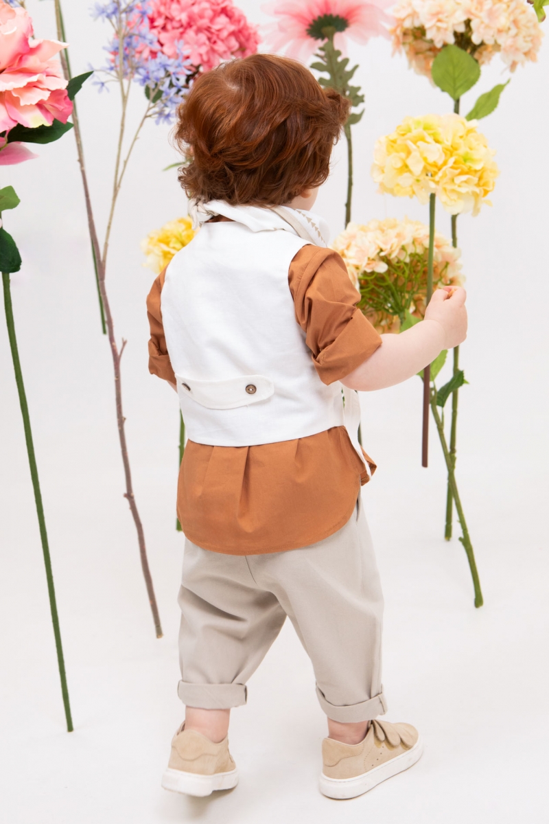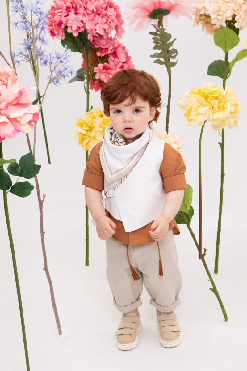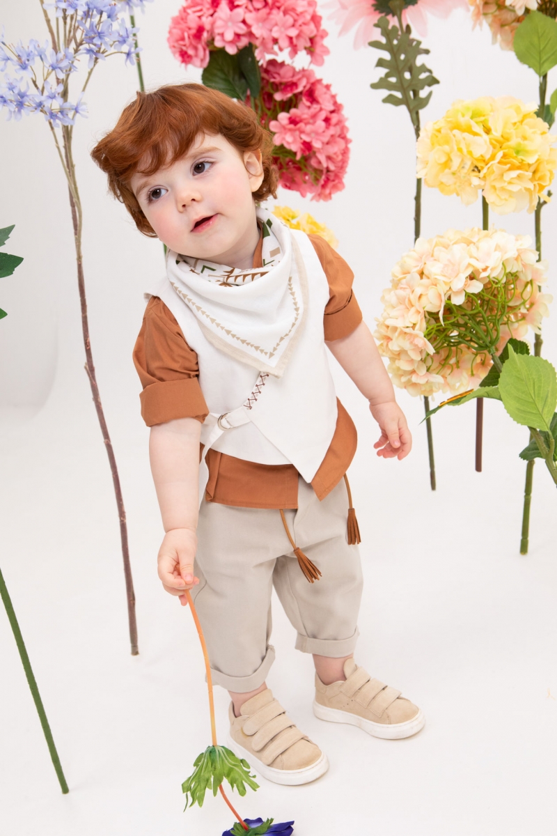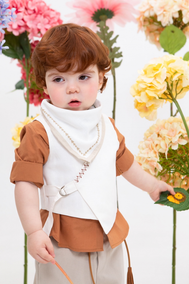 Ο Thanasis είναι ένας πολύ φρέσκος συνδυασμός βάπτισης με πολύ στυλ. Αποτελείται από μπεζ παντελόνι εξαιρετικής ποιότητας, κεραμιδί πουκάμισο με μάο γιακά και εκρού λινό γιλέκο με κέντημα που το κάνει πολύ chic. Αξεσουάρ είναι η ταμπά ζώνη, το λευκό καπέλο και το printed φουλάρι του.