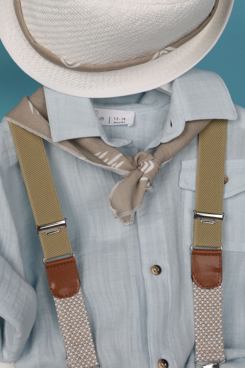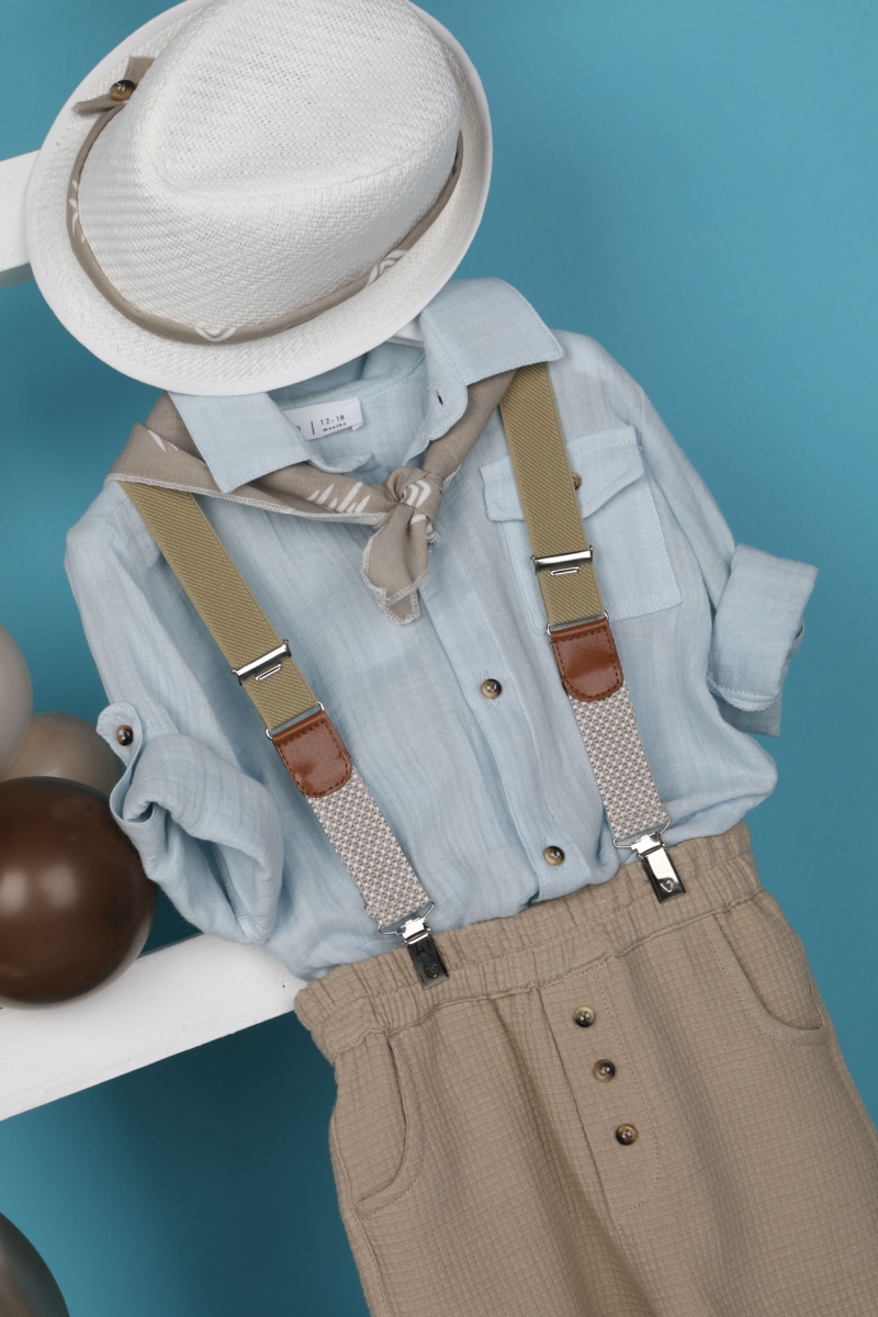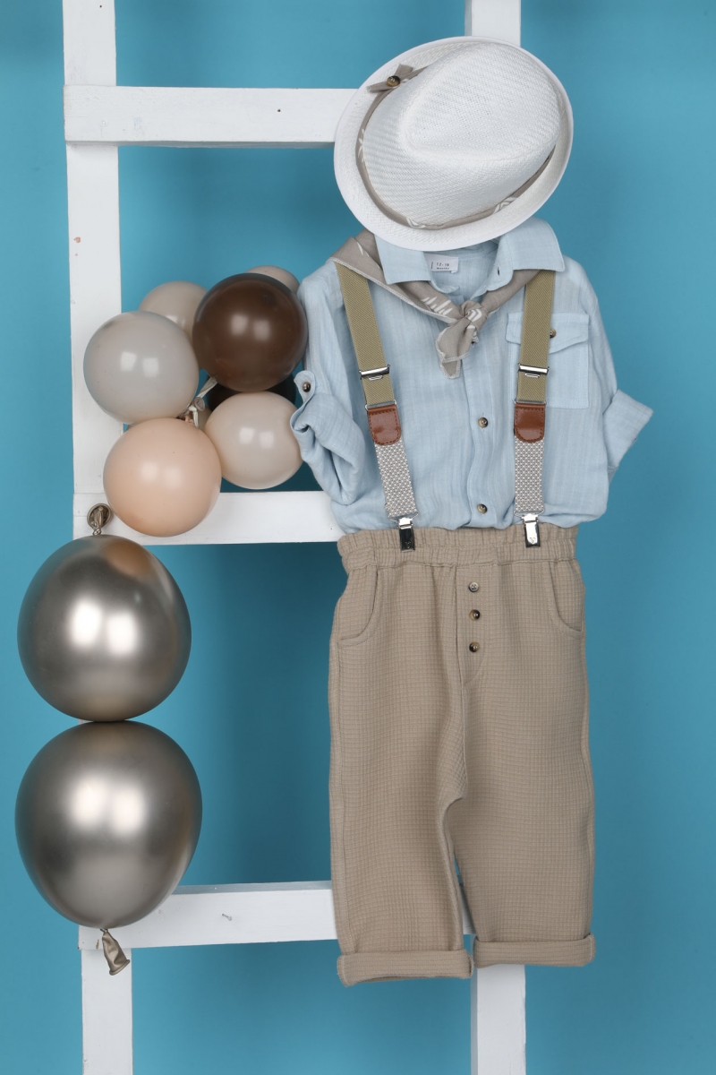 Ο Vaggelakis είναι ένας απλός και ταυτόχρονα chic συνδυασμός βάπτισης. Αποτελείται από μαλακό καφέ παντελόνι νταμάκι και σιέλ πουκάμισο με τσέπη. Αξεσουάρ είναι οι μπεζ τιράντες, το λευκό καπέλο και το καφέ printed φουλάρι του. ART: 1917, BAMBOLINO
