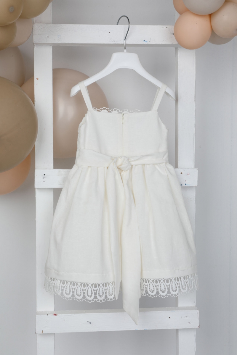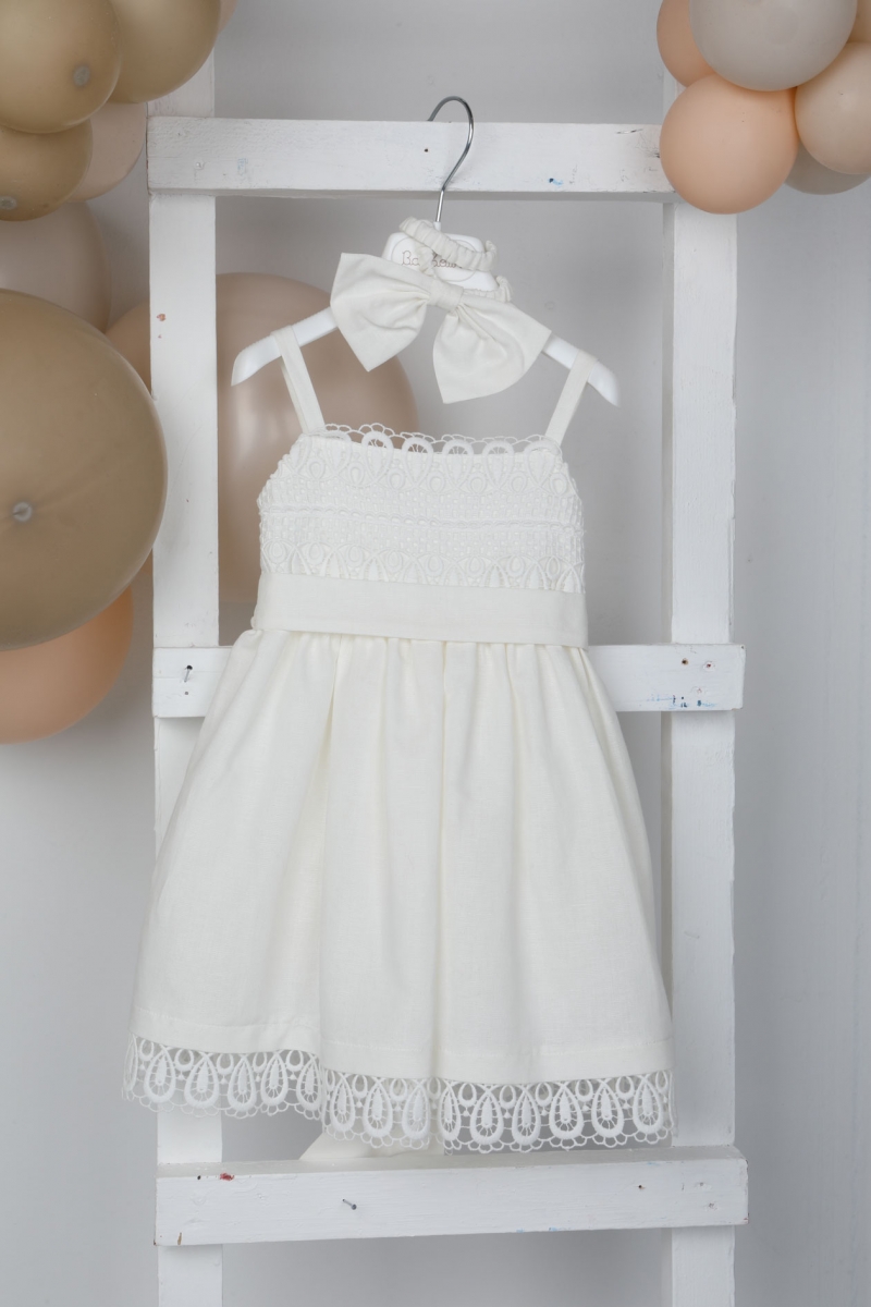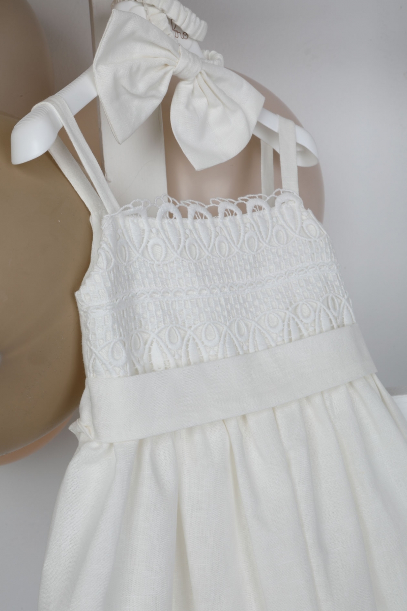 Η Agni έιναι ένα εκρού λινό φόρεμα με εξαιρετική βαμβακερή δαντέλα. Το πανέμορφο τελείωμα της φούστας και η κορδέλα για το κεφάλι με τον φιόγκο , του δίνουν μια ξεχωριστή νότα. ART: 1819, BAMBOLINO.