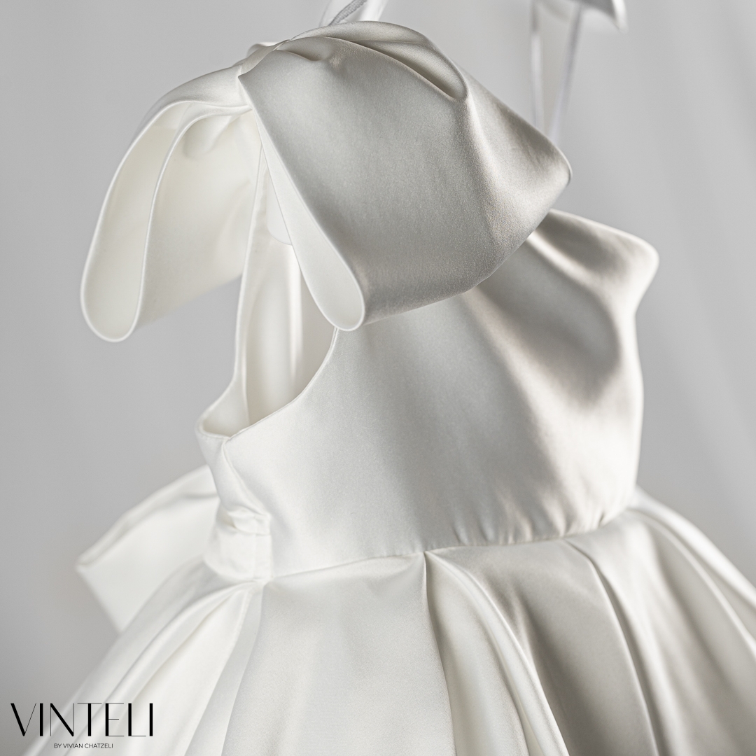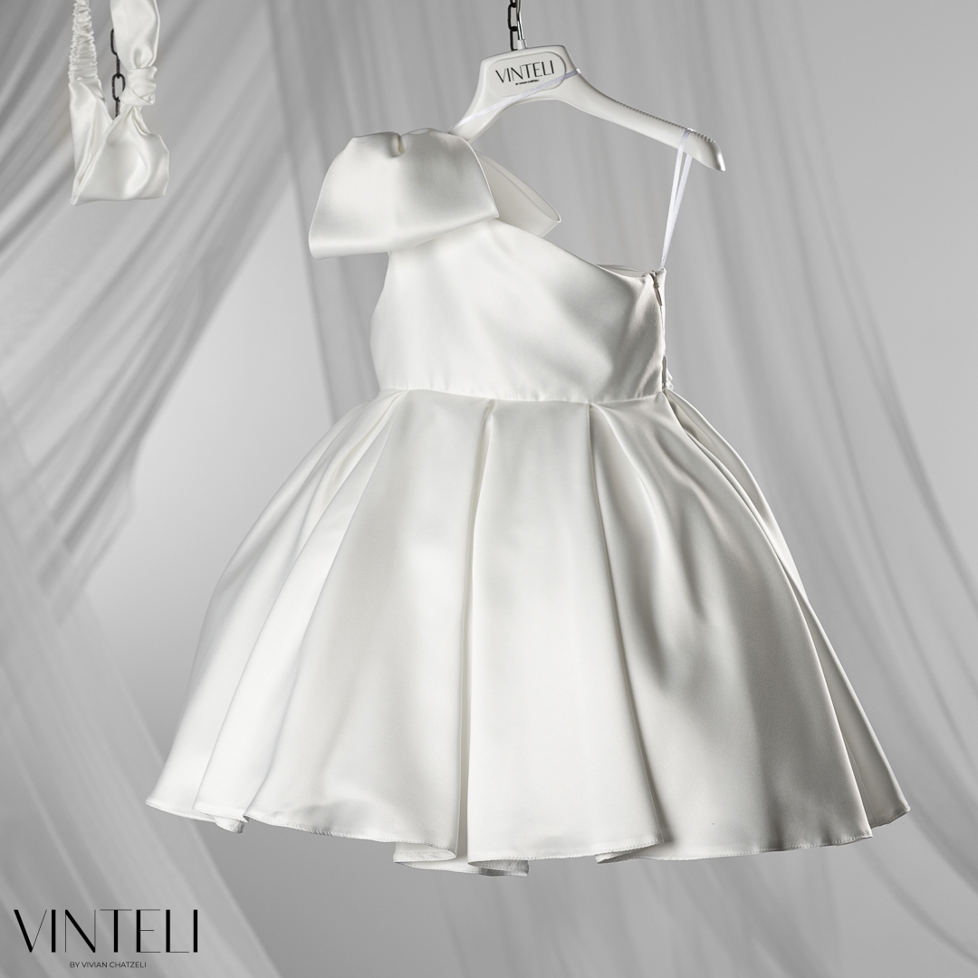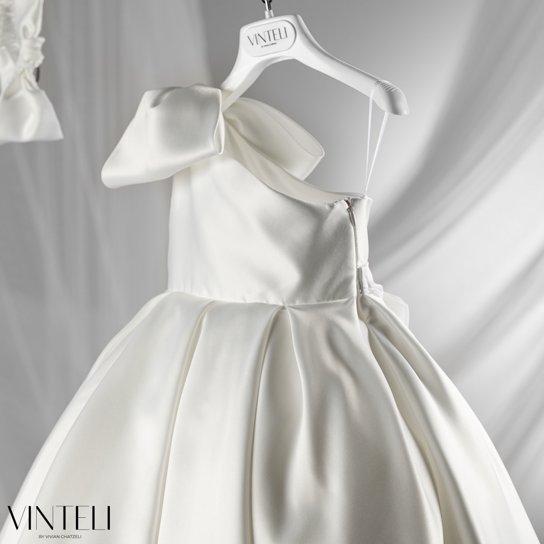 Βαπτιστικό φόρεμα σε ιβουάρ απόχρωση που αποπνέει κομψότητα και διακριτική πολυτέλεια. Το μπούστο είναι λιτό με ασύμμετρο κόψιμο στον έναν ώμο που χαρίζει μια μοντέρνα και ιδιαίτερη αισθητική, ενώ ο σατέν εντυπωσιακός φιόγκος δίνει χαρακτήρα και ξεχωρίζει διακριτικά. Η φούστα ανοίγει σε πλούσια γραμμή, δημιουργώντας όμορφη κίνηση και όγκο. Συνοδεύεται από ασορτί κορδέλα μαλλιών, ολοκληρώνοντας αρμονικά την εμφάνιση. Μια κομψή και ξεχωριστή επιλογή για βάπτιση, ιδανική για ιδιαίτερες και αξέχαστες στιγμές.