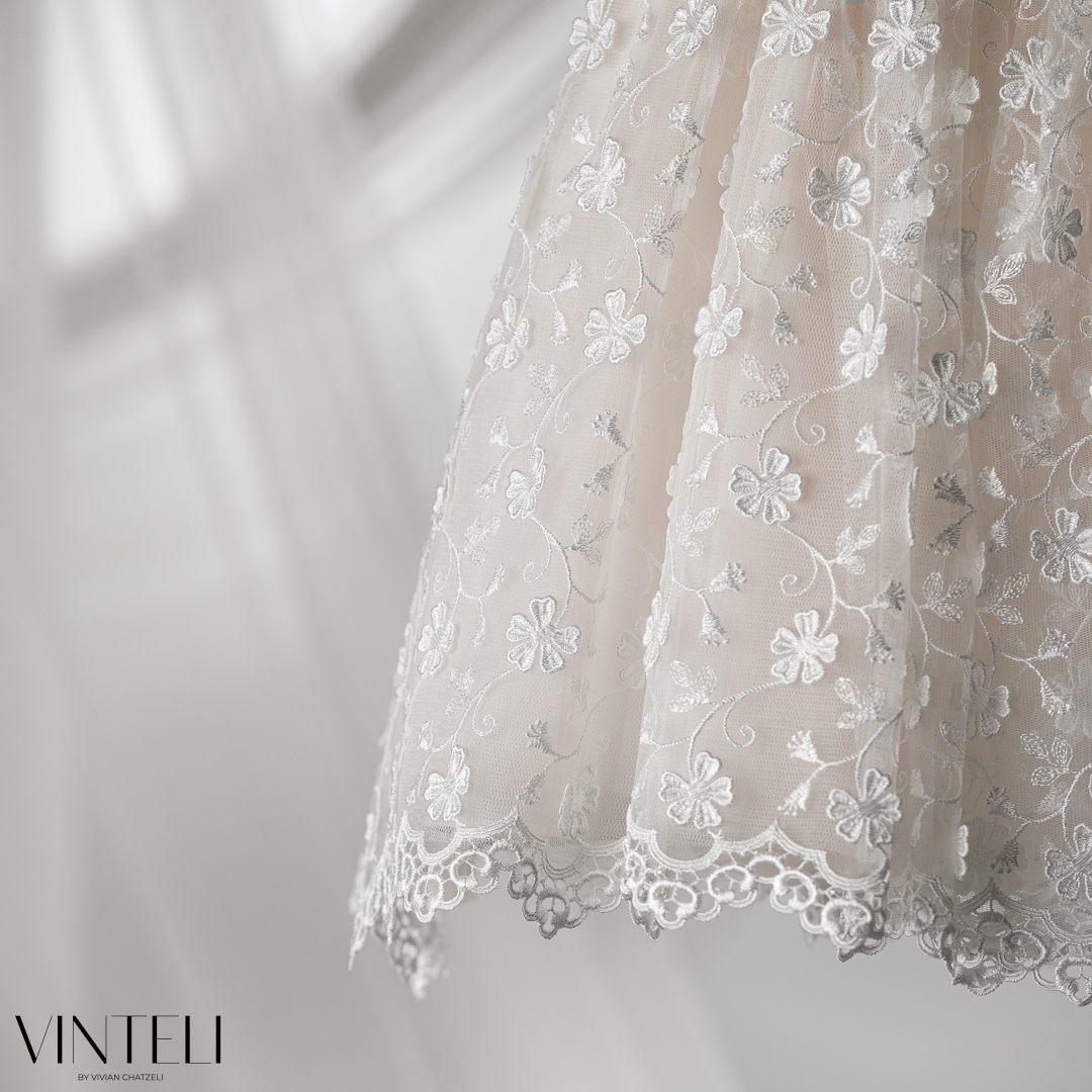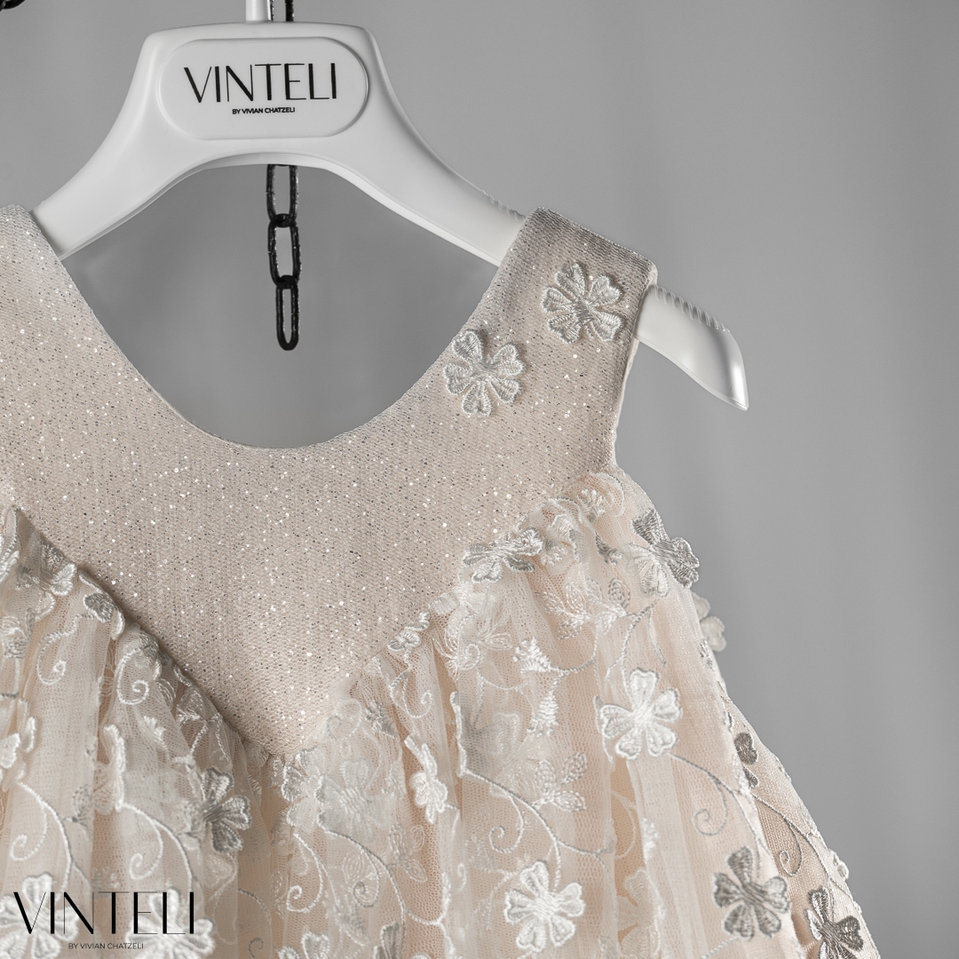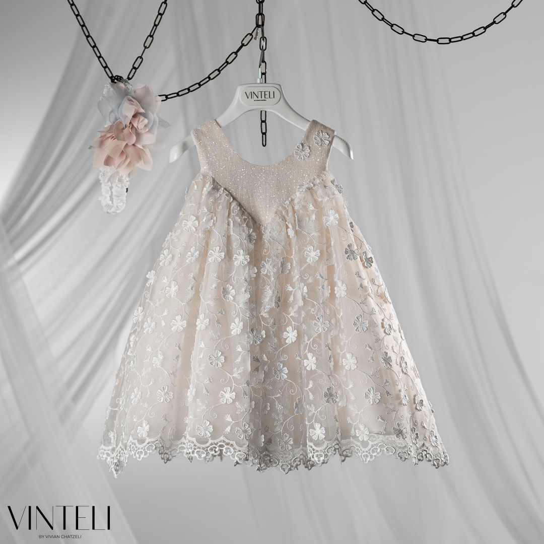 Βαπτιστικό φόρεμα που αποπνέει ρομαντισμό και διακριτική κομψότητα. Ξεχωρίζει με την υφή και τη διακριτική λάμψη, ενώ οι λεπτομέρειες από κεντημένα λουλουδάκια προσθέτουν μια ιδιαίτερη και χαριτωμένη πινελιά. Η φούστα ανοίγει πλούσια, δημιουργώντας όμορφη κίνηση και αέρινη αίσθηση. Συνοδεύεται από ασορτί κορδέλα μαλλιών, προσθέτοντας μια γλυκιά και κομψή λεπτομέρεια. Μια ρομαντική επιλογή για βάπτιση, ιδανική για ξεχωριστές στιγμές.