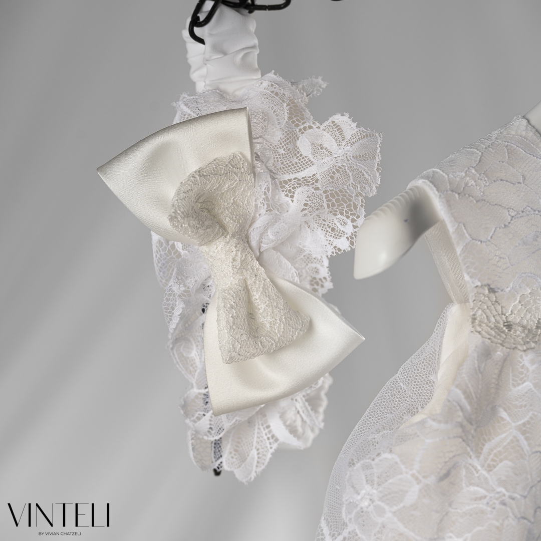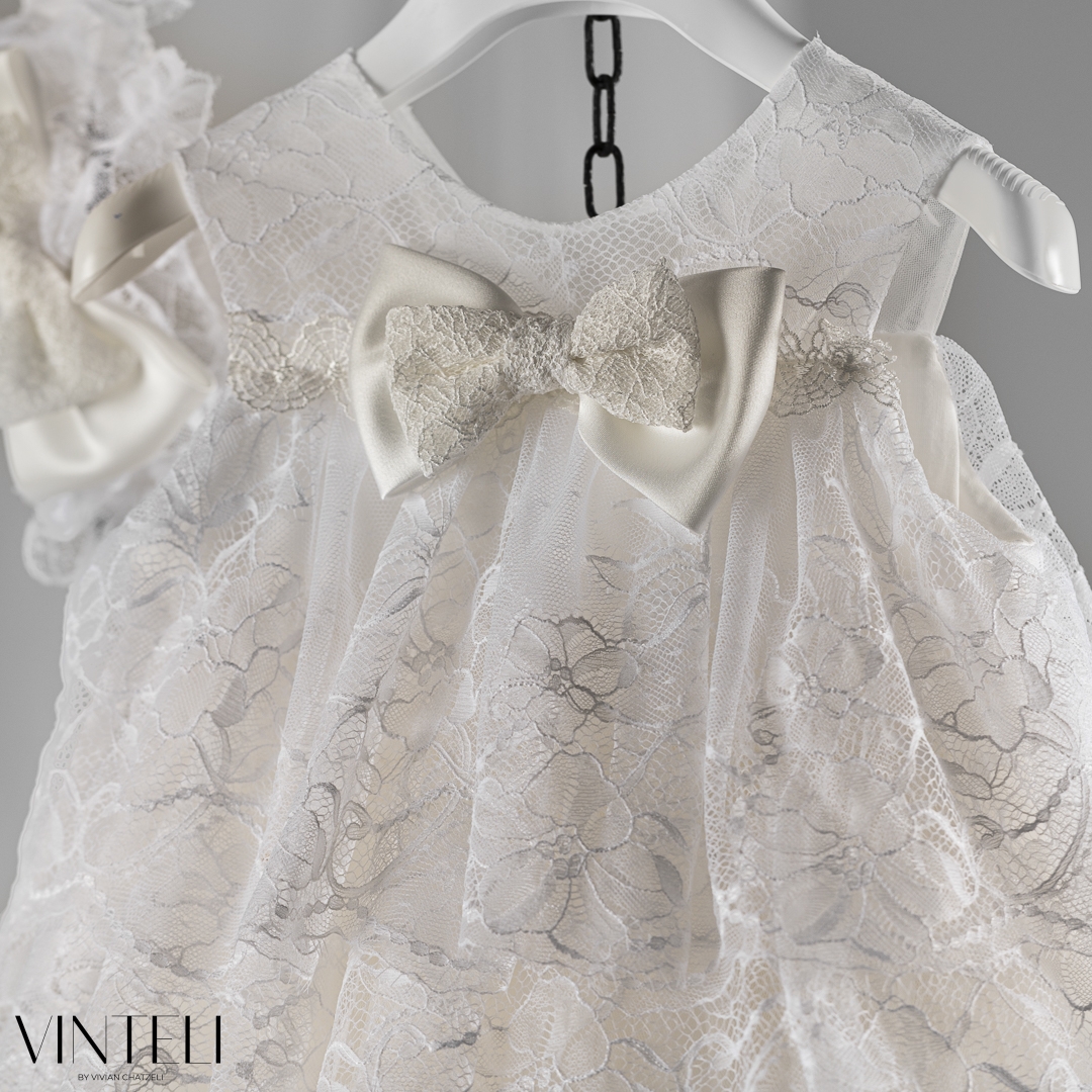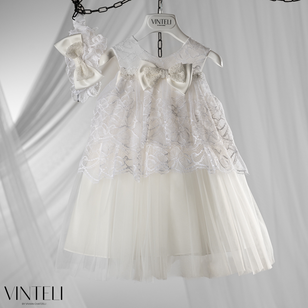 Βαπτιστικό φόρεμα με ρομαντικό και κομψό χαρακτήρα. Το επάνω μέρος διακοσμείται με δαντέλα, χαρίζοντας ένα ιδιαίτερο και ξεχωριστό αποτέλεσμα, ενώ ο μικρός φιόγκος στο μπροστινό μέρος προσθέτει μια διακριτική και γλυκιά λεπτομέρεια. Η φούστα από τούλι ανοίγει απαλά, δημιουργώντας όμορφη κίνηση και ανάλαφρη αίσθηση. Ο συνδυασμός των υφών δίνει ένα κομψό και ισορροπημένο σύνολο. Συνοδεύεται από ασορτί κορδέλα μαλλιών, ολοκληρώνοντας αρμονικά την εμφάνιση.