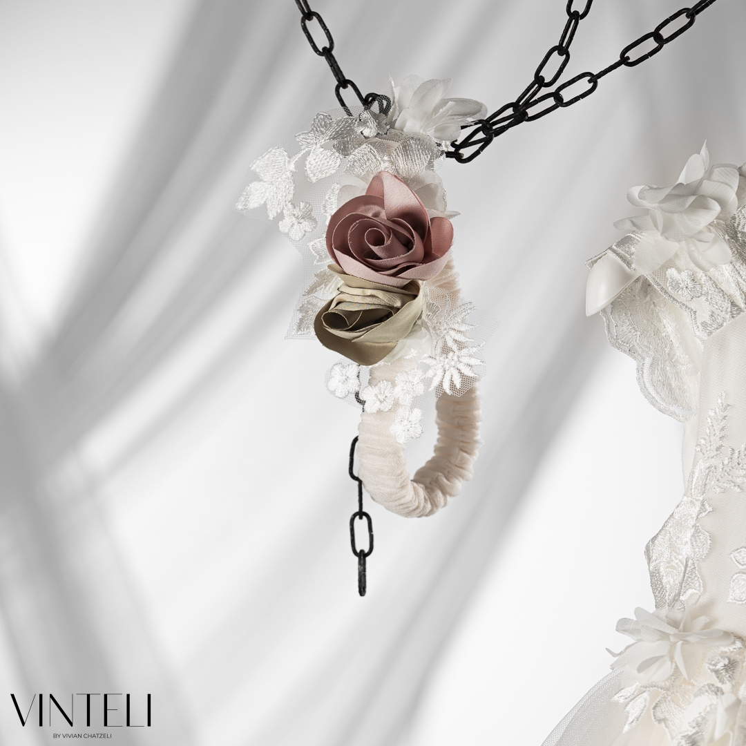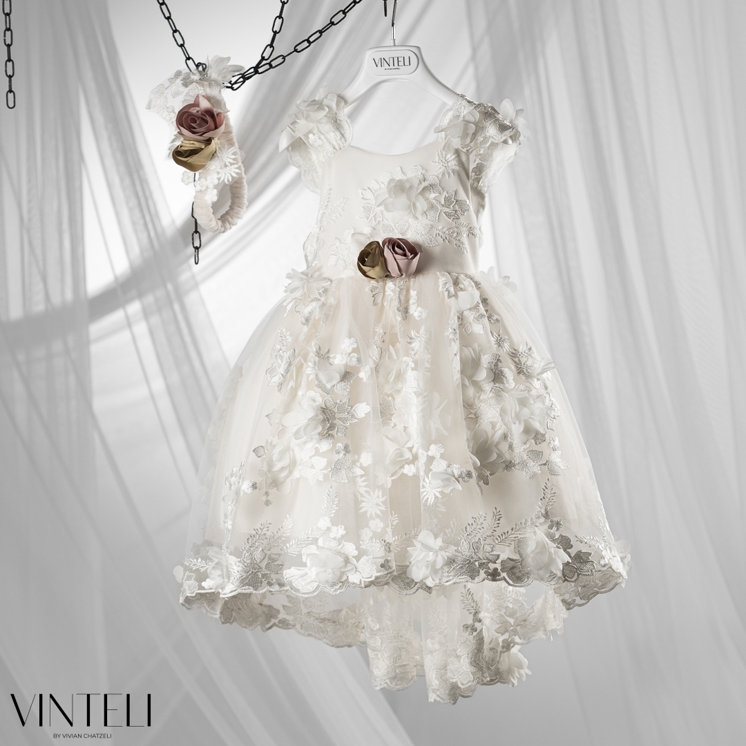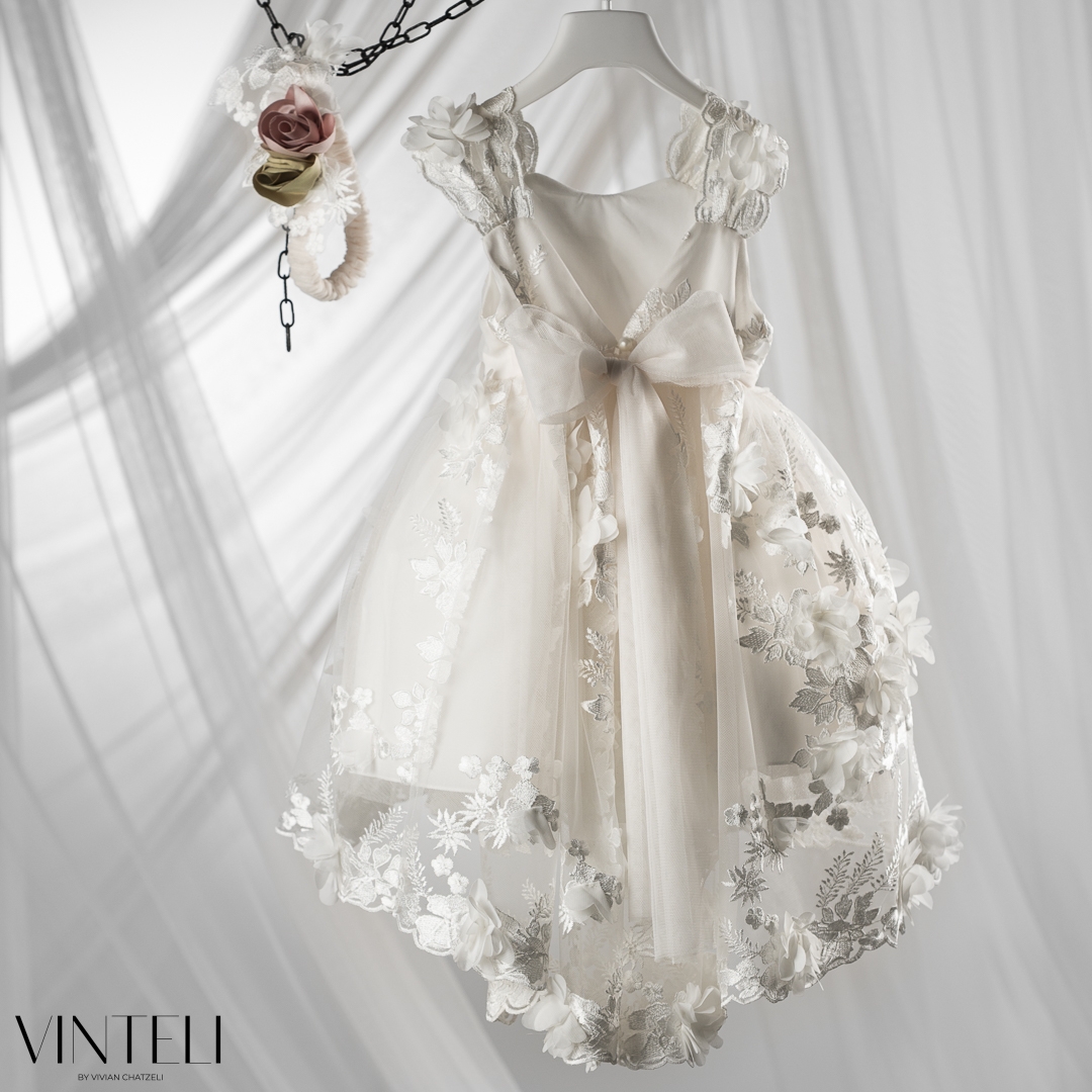 Βαπτιστικό φόρεμα σε εκρού απόχρωση, με ανάλαφρη τούλινη φούστα και ρομαντικά λουλουδένια κεντήματα που δίνουν ζωντάνια και κίνηση. Το μπούστο εφαρμόζει απαλά, ενώ τα χειροποίητα λουλούδια στη μέση προσθέτουν μια ιδιαίτερη, γλυκιά λεπτομέρεια. Το σύνολο συνοδεύεται από ασορτί κορδέλα μαλλιών που ολοκληρώνει ιδανικά την εμφανιση.