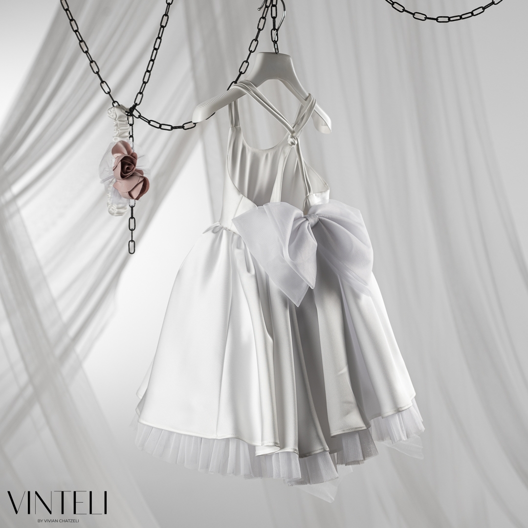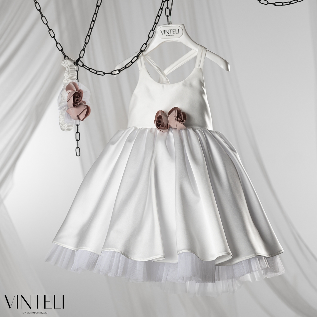 Βαπτιστικό φόρεμα σε λευκή απόχρωση από απαλό σατέν, με πλούσια φούστα που ανοίγει όμορφα και χαρίζει κίνηση. Το λιτό μπούστο αναδεικνύεται από τα διακριτικά χειροποίητα λουλούδια στη μέση, προσθέτοντας μια γλυκιά, ιδιαίτερη πινελιά. Το σύνολο συνοδεύεται από ασορτί κορδέλα μαλλιών που ολοκληρώνει ιδανικά την εμφάνιση. Μια σύγχρονη επιλογή για τη βάπτιση, που ξεχωρίζει με την απλότητά της.