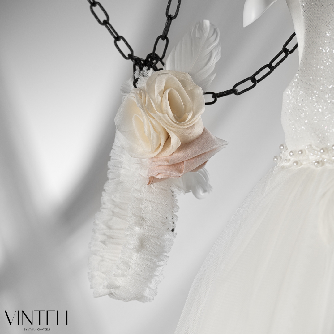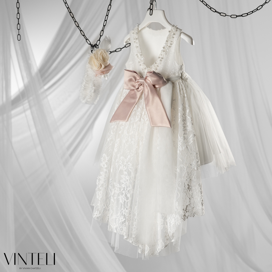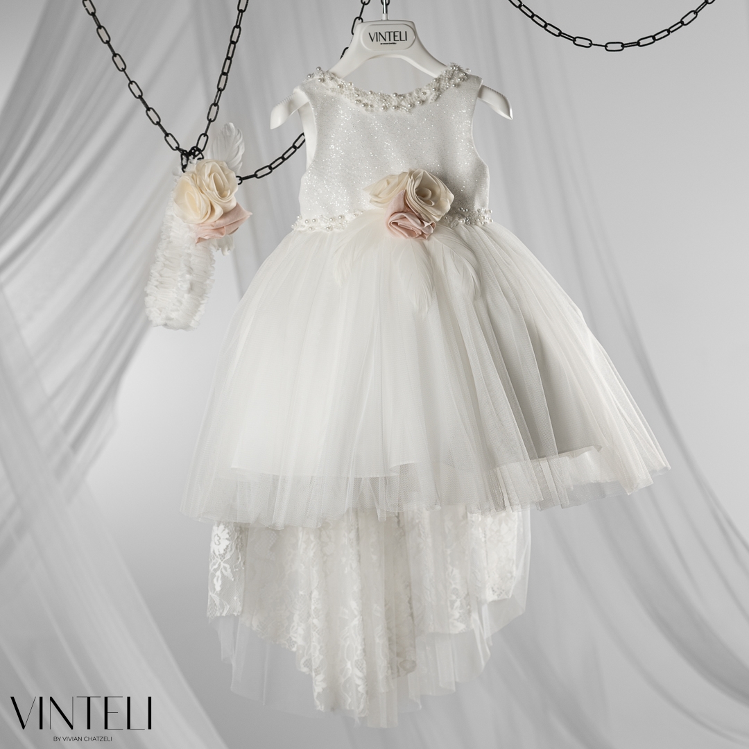 Βαπτιστικό φόρεμα σε κομψή ιβουάρ απόχρωση, από απαλό τούλι και φίνα υφάσματα που χαρίζουν ανάλαφρη κίνηση και ρομαντική διάθεση. Η φούστα είναι πλούσια και πολυεπίπεδη, ενώ στο πίσω μέρος καταλήγει σε διακριτική ουρά, προσθέτοντας έναν αέρα παραμυθένιας κομψότητας. Το μπούστο ξεχωρίζει για τη διακριτική λάμψη και τις προσεγμένες λεπτομέρειες με πέρλες στο λαιμό και στη μέση, που αναδεικνύουν το σχέδιο. Στο κέντρο, χειροποίητα λουλούδια σε απαλούς ροζ και εκρού τόνους δίνουν μια ρομαντική πινελιά και ολοκληρώνουν αρμονικά το σύνολο. Το σύνολο συνοδεύεται από ασορτί κορδέλα μαλλιών που ολοκληρώνει ιδανικά την εμφανιση. Μια ξεχωριστή επιλογή για βάπτιση, που συνδυάζει κομψότητα, λάμψη και παραμυθένιο χαρακτήρα για μοναδικές εμφανίσεις.