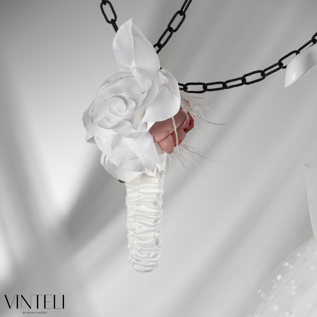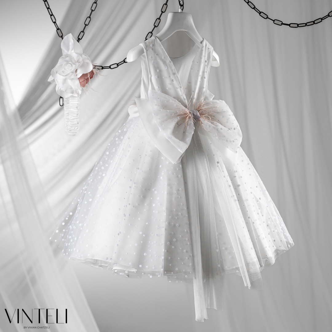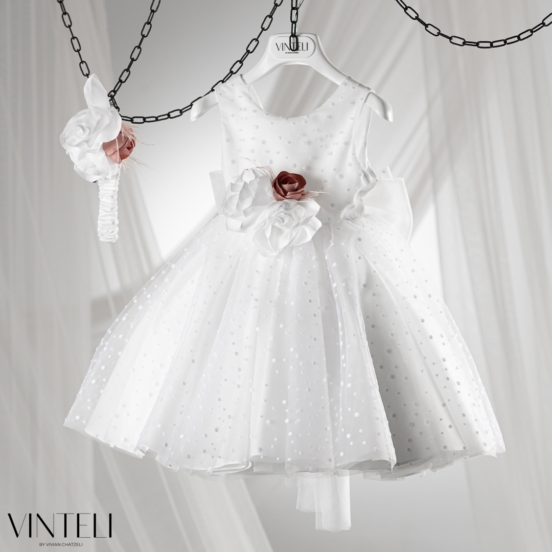 Βαπτιστικό φόρεμα σε ιβουάρ απόχρωση, από ανάλαφρο τούλι με διακριτικά πουά στοιχεία που χαρίζουν παιχνιδιάρικη υφή και κίνηση. Η φούστα ανοίγει πλούσια, δημιουργώντας μια αέρινη και κομψή σιλουέτα, ενώ στη μέση ξεχωρίζουν εντυπωσιακά χειροποίητα λουλούδια προσθέτοντας ρομαντισμό και μια ιδιαίτερη πινελιά. . Το σύνολο συνοδεύεται από ασορτί κορδέλα μαλλιών που ολοκληρώνει ιδανικά την εμφανιση. Μια μοντέρνα και ταυτόχρονα ρομαντική επιλογή για τη βάπτιση, ιδανική για ξεχωριστές εμφανίσεις.