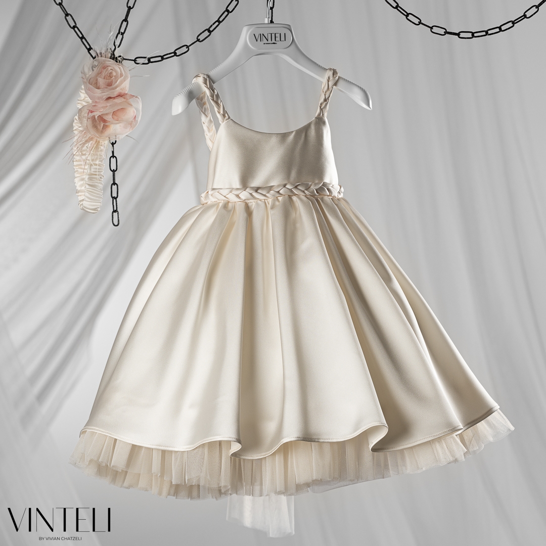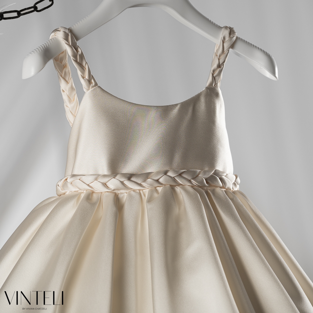 Βαπτιστικό φόρεμα σε απαλό εκρού τόνο, από σατέν ύφασμα που χαρίζει διακριτική λάμψη και κομψή εμφάνιση. Η φούστα ανοίγει πλούσια με όμορφη κίνηση, ενώ στο τελείωμα διακρίνεται τούλι που προσθέτει όγκο και μια αέρινη αίσθηση. Το μπούστο είναι λιτό και καλαίσθητο, με τιράντες που δένουν απαλά στους ώμους, ενώ στη μέση ξεχωρίζει πλεξούδα από το ίδιο ύφασμα, δημιουργώντας μια ιδιαίτερη και αρμονική λεπτομέρεια. Στο πίσω μέρος διαθέτει διακοσμητικό λουλούδι με παραμάνα, ώστε να μπορεί να τοποθετηθεί όπου επιθυμείτε, προσφέροντας ευελιξία και μια ξεχωριστή πινελιά στο σύνολο. Συνοδεύεται από ασορτί κορδέλα μαλλιών, ολοκληρώνοντας όμορφα την εμφάνιση. Μια κομψή και διαχρονική επιλογή για βάπτιση, ιδανική για ιδιαίτερες στιγμές.