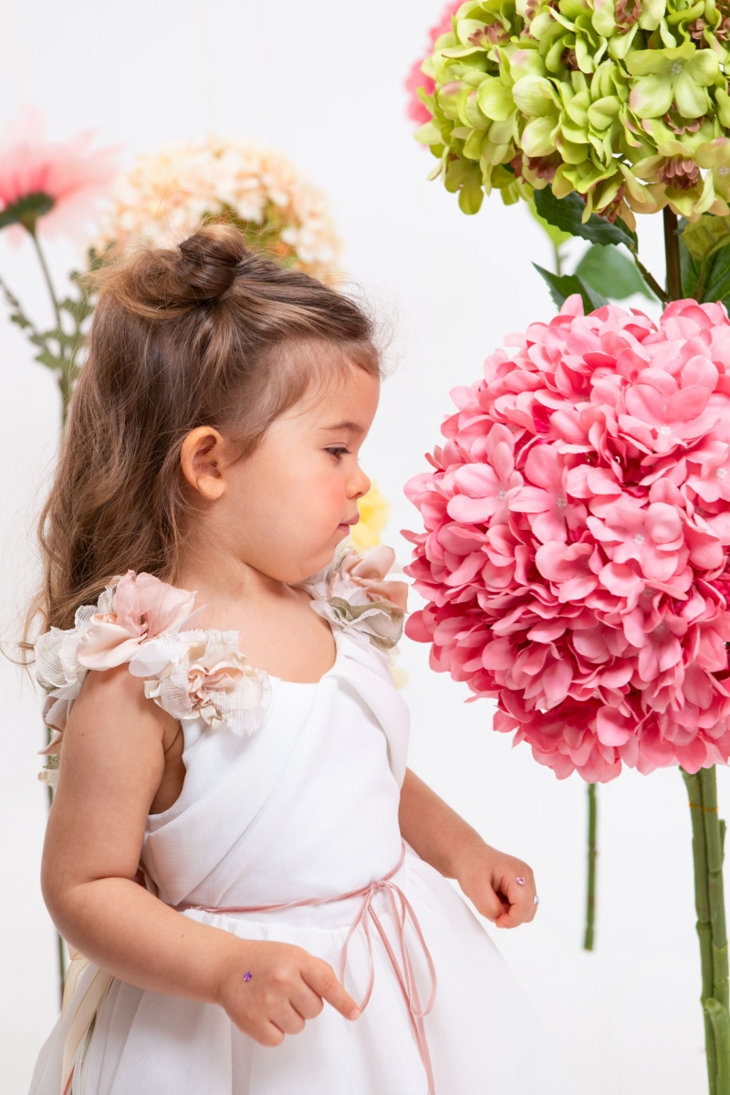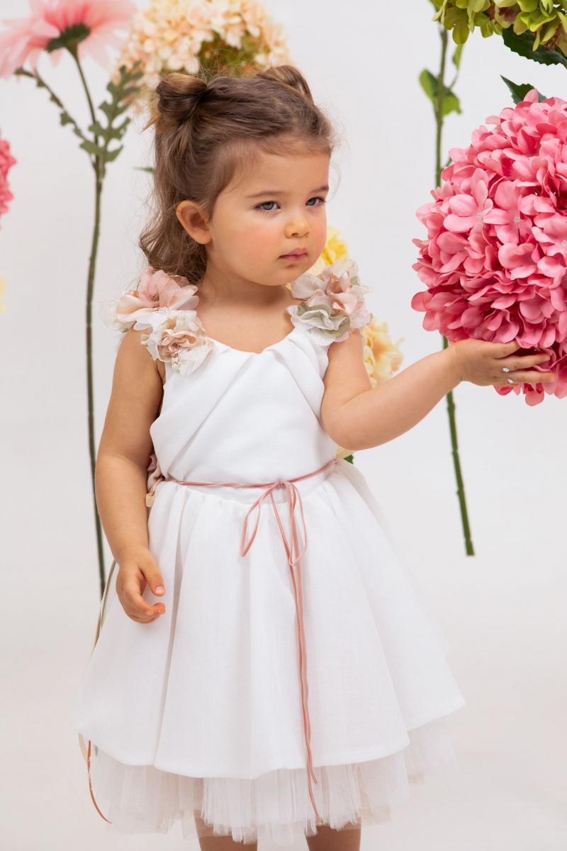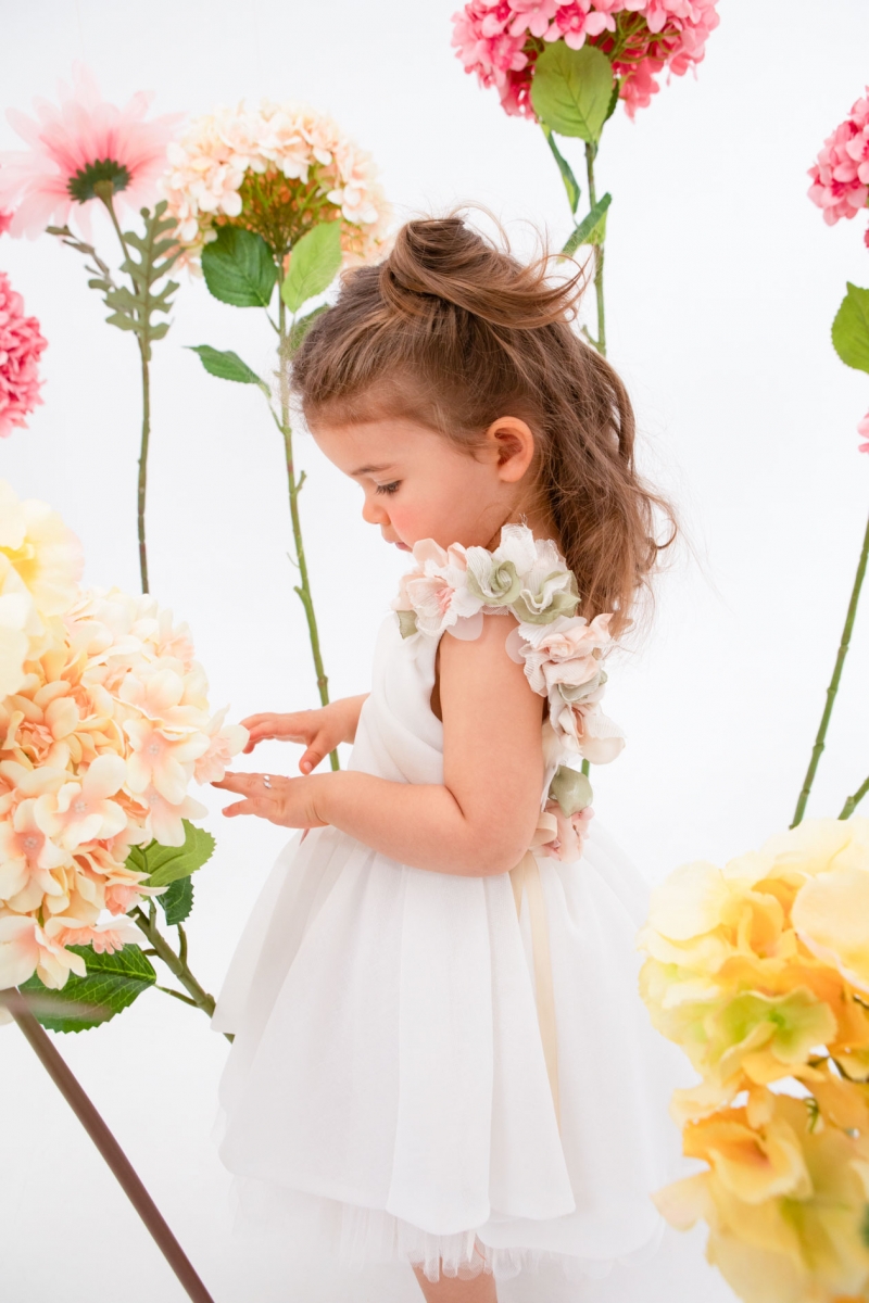 Η Ilektra είναι ένα εκρού ασύμμετρο φόρεμα βάπτισης σε πούδρα αποχρώσεις. Τα tutu τούλια που βρίσκονται στην φούστα του , του δίνουν ένα ασύλληπτο αέρα και τα πολύχρωμα λουλούδια που το στολίζουν το κάνουν καταπληκτικό. Το σύνολο ολοκληρώνεται με στέκα για το κεφάλι.