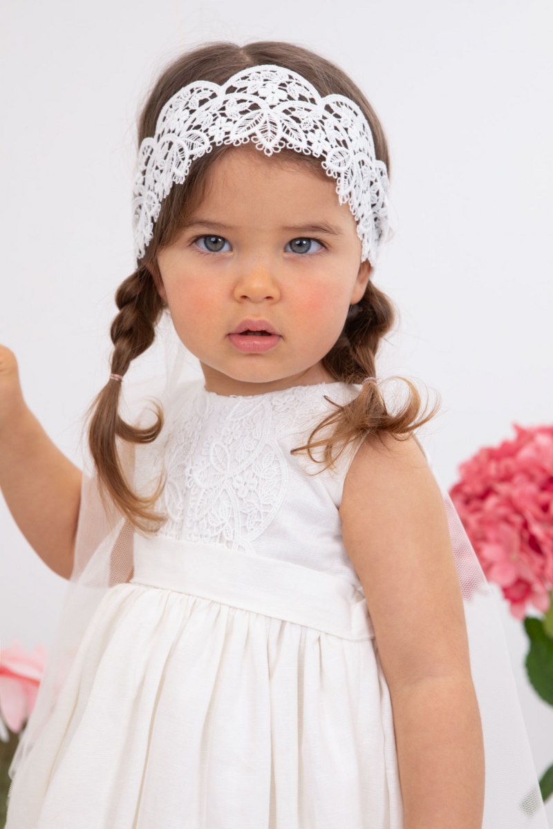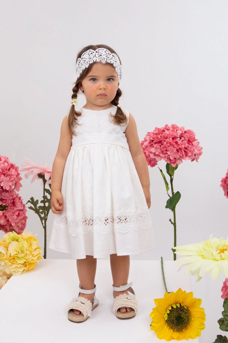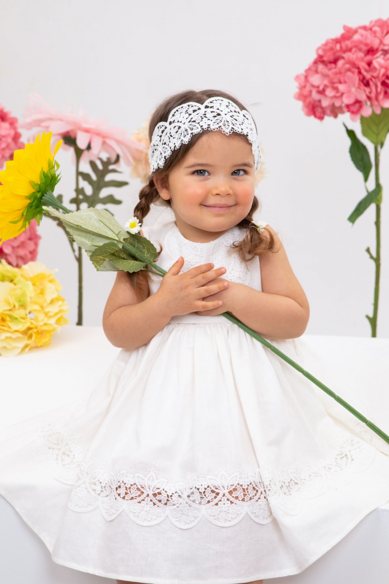 Η Ioanna είναι ένα baby chic αμάνικο εκρού λινό φόρεμα βάπτισης με βαμβακερή δαντέλα. Περιλαμβάνει ιδιαίτερη κορδέλα για το κεφάλι. ART: 1815, BAMBOLINO.