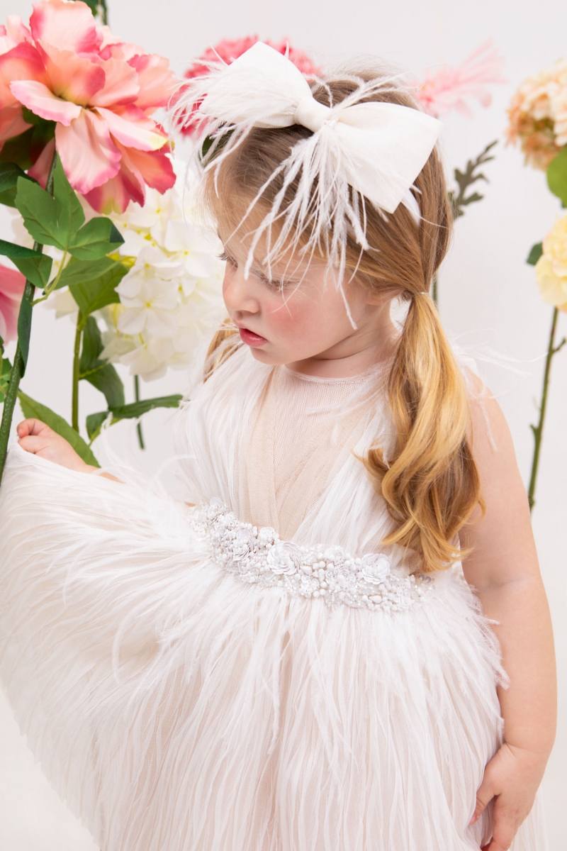 H Jenny είναι ένα ρομαντικό φόρεμα βάπτισης στο χρώμα της πούδρας, από πλισέ γαλλικό βαμβακερό τούλι εξαιρετικής ποιότητας. Τα αέρινα φτερά του και η κεντημένη χειροποίητη ζώνη του με κρύσταλλα δίνουν μία νότα πολυτέλειας. Το ρούχο συνοδεύεται από χειροποίητη στέκα για το κεφάλι.