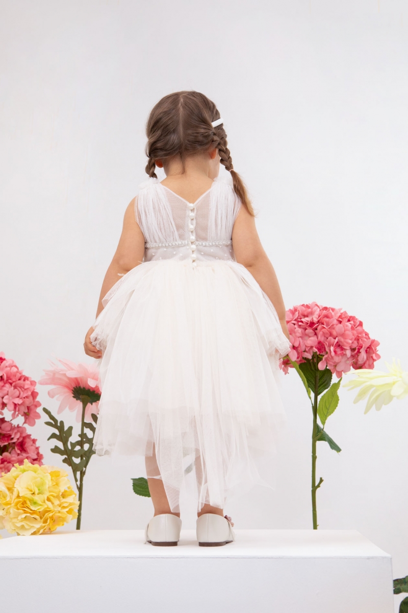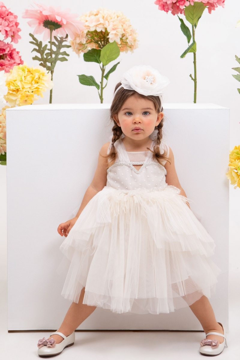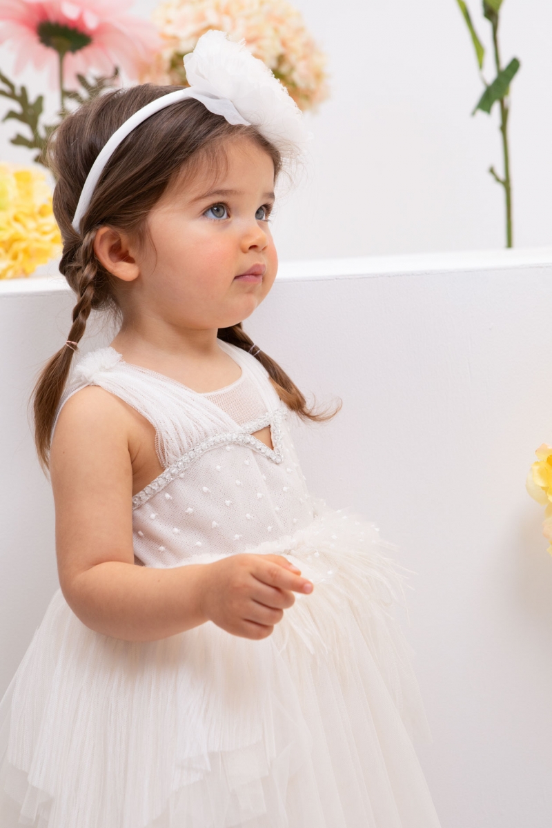 Η Myrsini είναι ένα βαπτιστικό σύνολο σε ιβουάρ αποχρώσεις. Το chic μπούστο του σε σχήμα καρδιάς το κάνει ξεχωριστό και τα πουπουλάκια του το κάνουν παιχνιδιάρικο. Το σύνολο ολοκληρώνεται με στέκα με χειροποίητο λουλούδι. ART: 1809, BAMBOLINO.