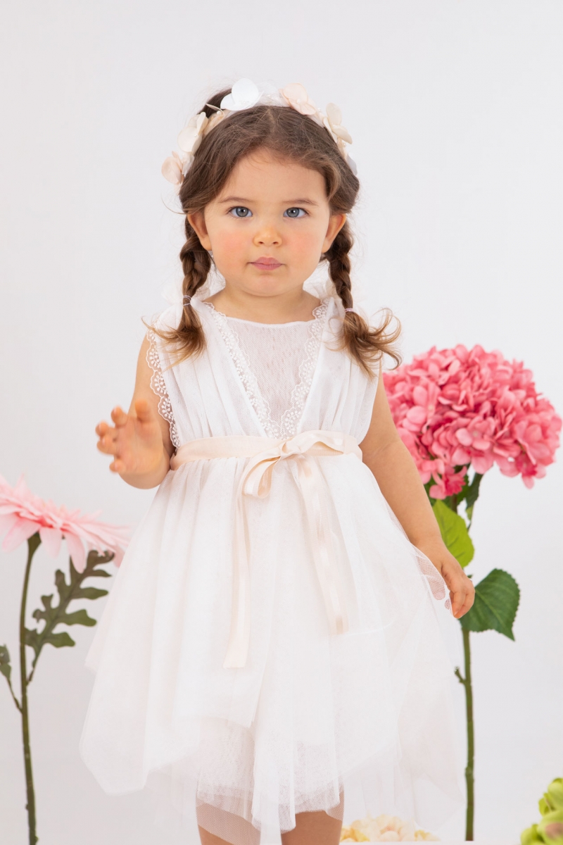 H Olympia είναι ένα εκρού τούλινο φόρεμα βάπτισης με λεπτομέρειες από βαμβακερή δαντέλα εξαιρετικής ποιότητας. Η σομών ζώνη του , το στολίζει και το handmade πολύχρωμο στεφανάκι για το κεφάλι το ολοκληρώνει. ART: 1828, BAMBOLINO.