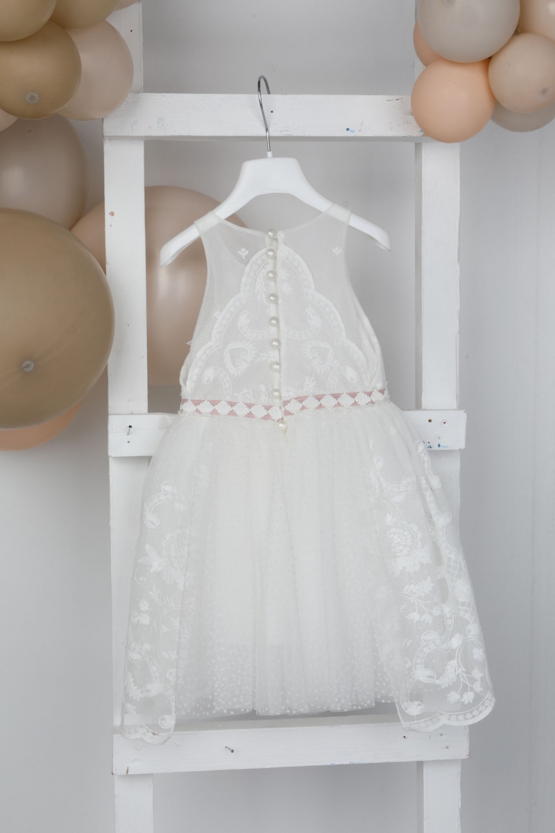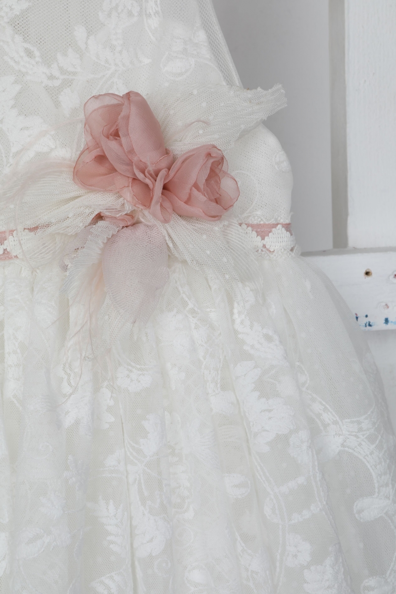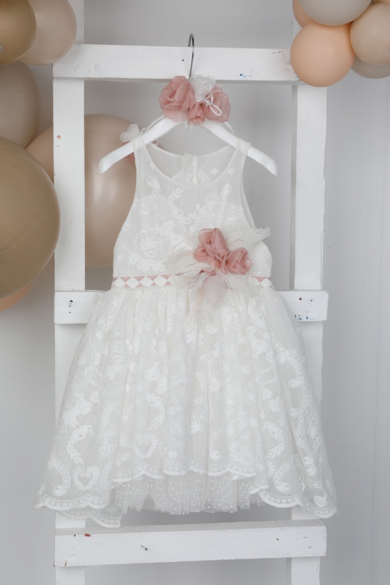 H Sotiria είναι ένα εκρού δαντελένιο φόρεμα βάπτισης το οποίο στολίζεται από χειροποίητα λουλούδια στο χρώμα του σάπιο μήλου. Οι λεπτομέρειες στην πλάτη του ρούχου δημιουργούν ένα κλασικό συνδυασμό που έχει ιδιαίτερο ενδιαφέρον. Το στεφανάκι για το κεφάλι το ολοκληρώνει.