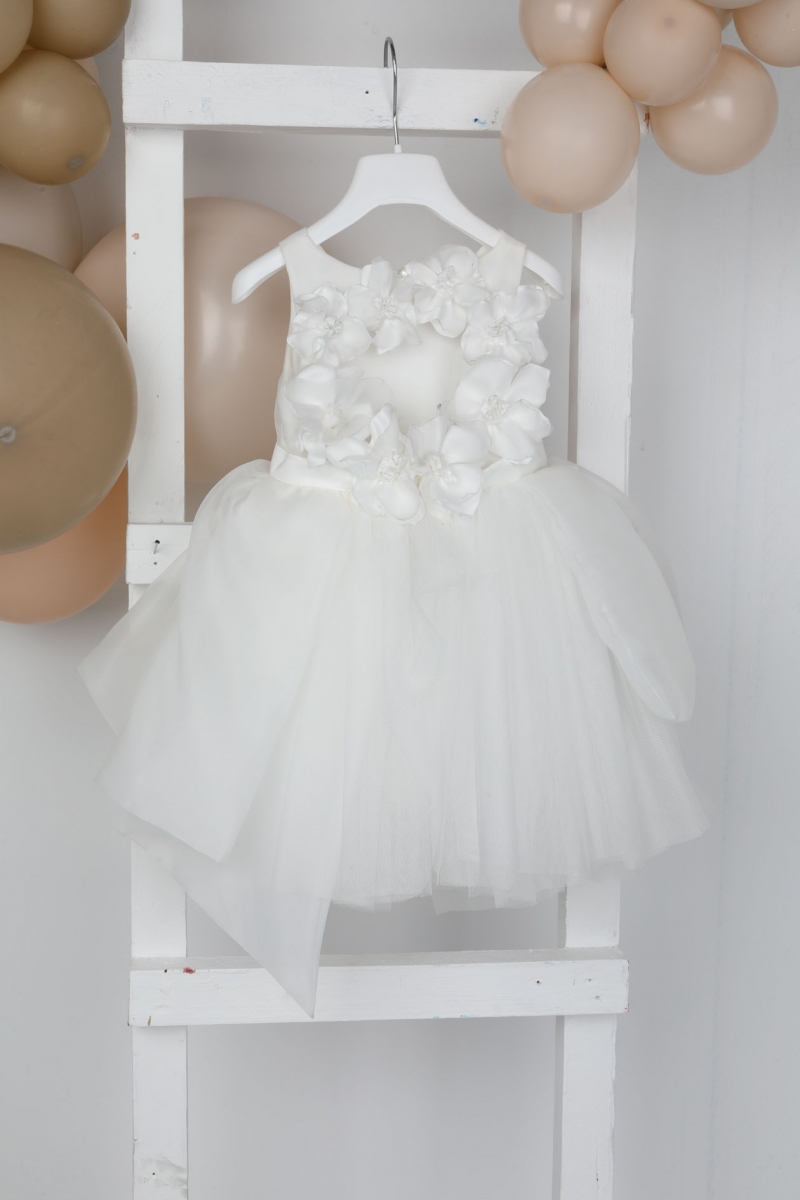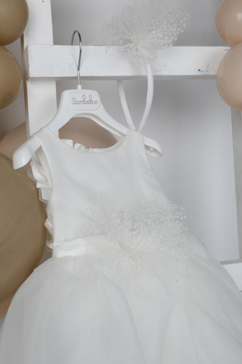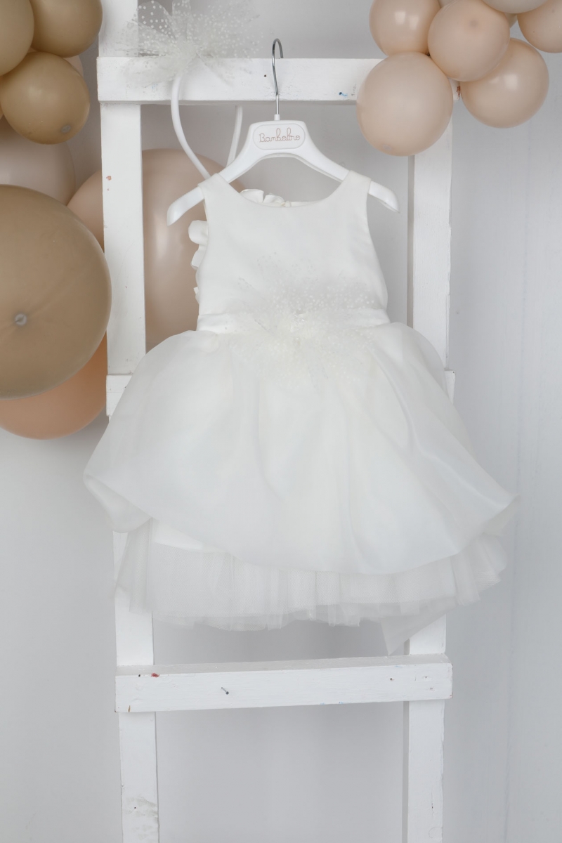 Η Virginia είναι ένα εκρού φόρεμα βάπτισης με σατέν μπούστο και ιδιαίτερα στολισμένη πλάτη με χειροποίητα λουλούδια. Η balloon φούστα από οργάντζα του δίνει μία exclusive νότα και η handmade στέκα για το κεφάλι το ολοκληρώνει. ART: 1838, BAMBOLINO.